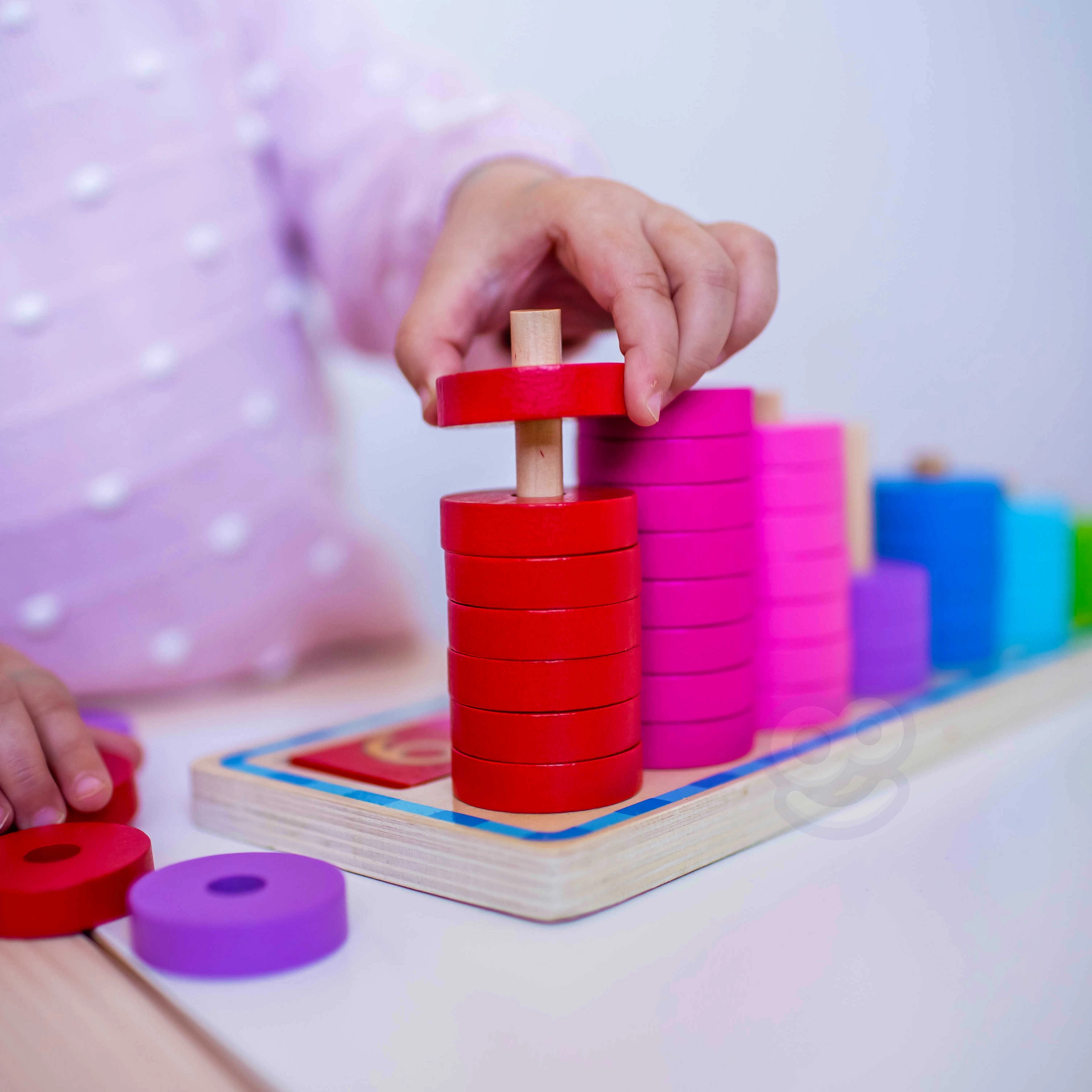 Lapsed seostavad värvilised rõngad numbritega ning õpivad intuitiivselt loendama, värve ära tundma ja mõisteid rohkem–vähem mõistma.