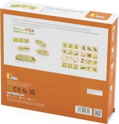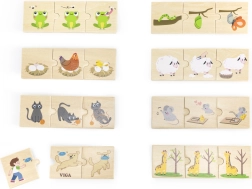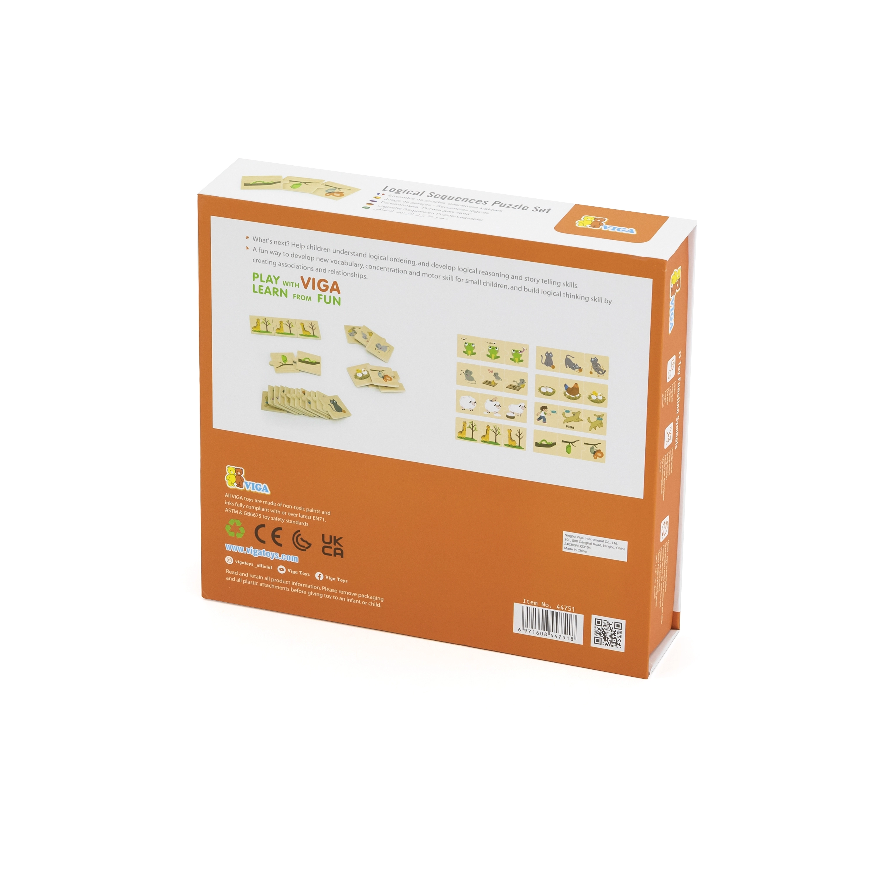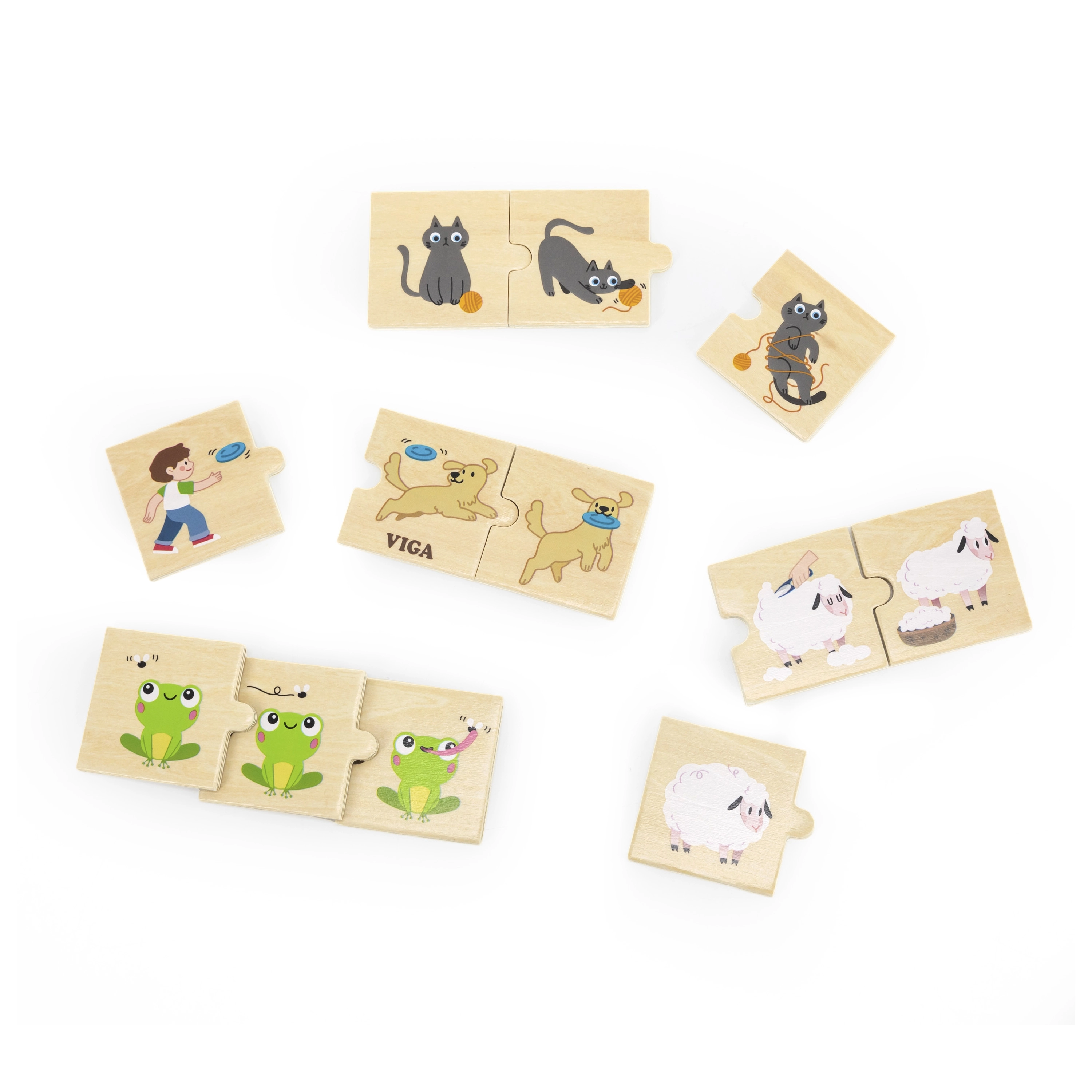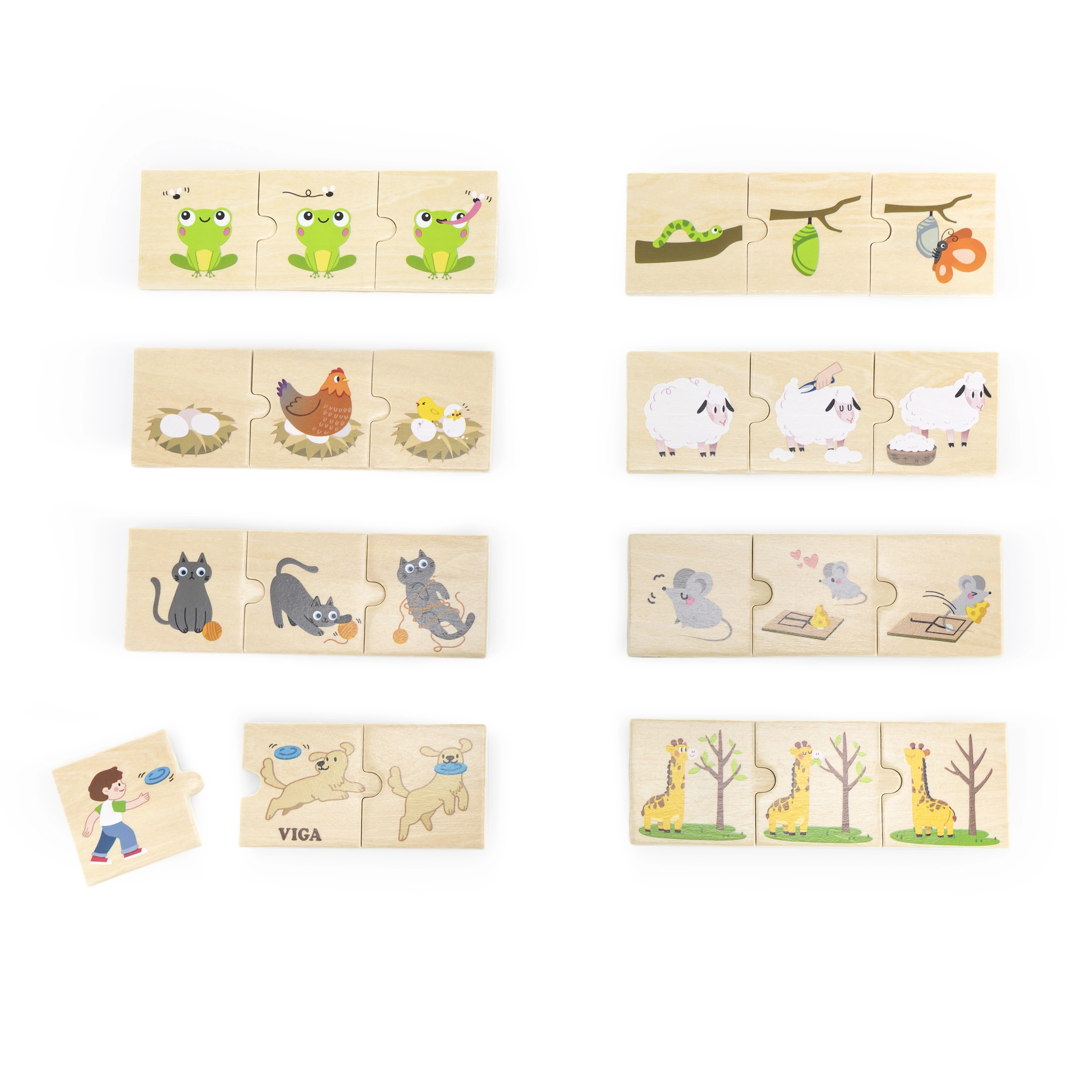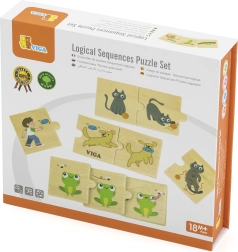 Lõbus ja hariv VIGA puidust puslede komplekt õpetab lastel loomategevusi õigesse järjekorda seadma. Komplektis on 24 puidust tükki, millest saab kokku panna 8 loogilist järjestust (nt koera apportimine või kaelkirjak, kes rebib puult lehti). Arendab loogilist mõtlemist, sõnavara, kontsentratsiooni, peenmotoorikat ja nägemis-motoorset koordinatsiooni ning sobib juba alates 18. elukuust.