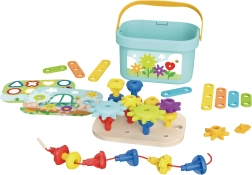 Selle karbiga saavad lapsed nautida 12 erinevat tegevust ühes kompaktses komplektis – mustrite ladumisest, kujundite ja värvide õppimisest kuni 3D-ehitisteni. Kõik osad saab hõlpsasti karpi sisse hoiustada, mis teeb kaasavõtmise ja korrastamise mugavaks. Toode on valmistatud looduslikust puidust ning ümardatud servad tagavad maksimaalse ohutuse.