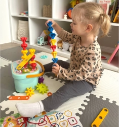 Pisidetailidega toimetamine ja läbipõimimine toetab peenmotoorika ning koordinatsiooni arengut.