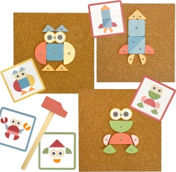 Täiskomplekt puidust kujundite, väikeste naelte, haamri ja korgist alusega. Lapsed saavad laduda etteantud kaartide järgi või lähtuda oma fantaasiast.