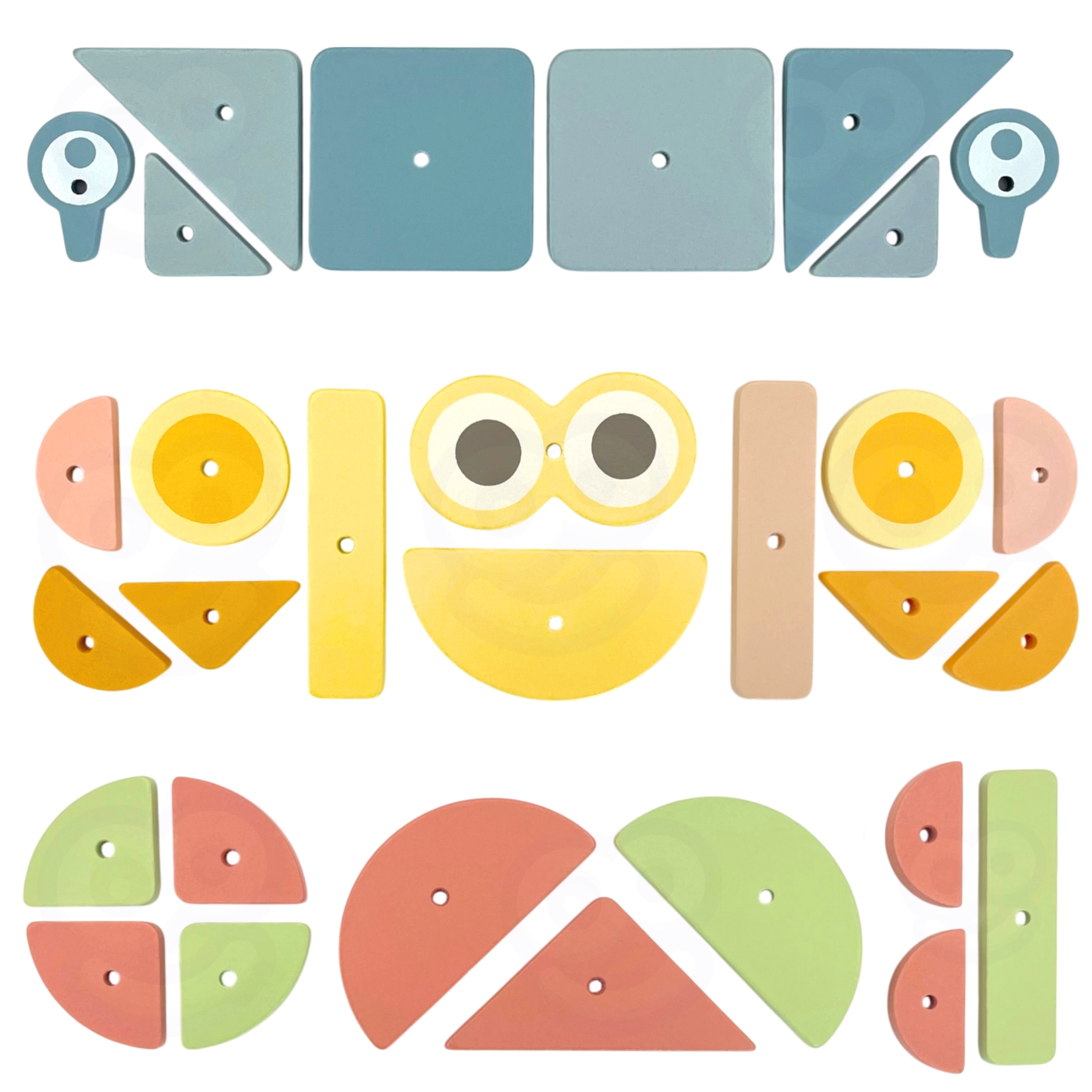 Komplekt sisaldab 30 puidust detaili, 40 väikest naela, puidust haamrit, korgist alust ning 10 kahepoolset kaarti 20 motiiviga kolmel raskusastmel. Suurepärane valik peenmotoorika, silm–käsi koordinatsiooni ja ruumilise mõtlemise arendamiseks.