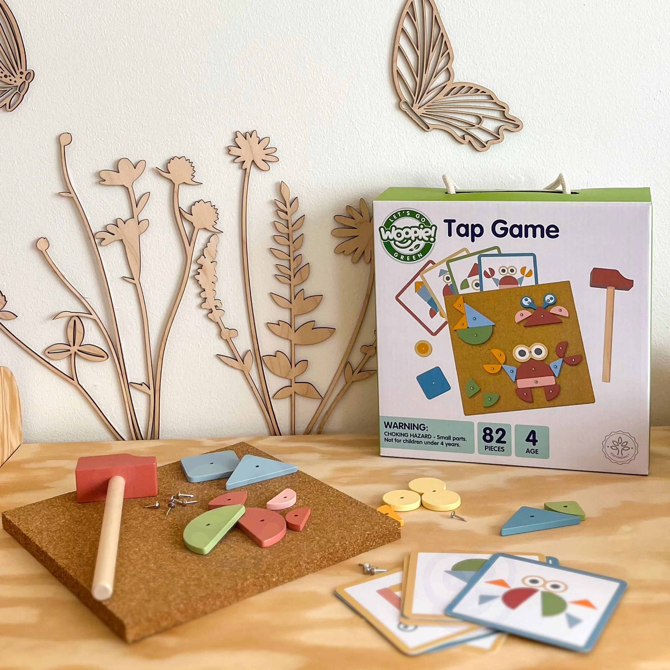 Loo ja õpi komplektiga puidust naelapaneel WOOPIE GREEN! Värvilised geomeetrilised kujundid kinnitatakse naelte ja haamriga korgist alusele kaartide järgi või oma fantaasia abil. Kuni 82 osa, 20 mustrit ja 3 raskusastet arendavad peenmotoorikat, loomingulisust, loogilist mõtlemist ning kontsentratsiooni alates 4. eluaastast.