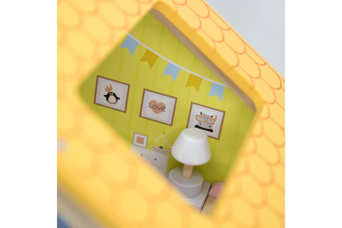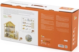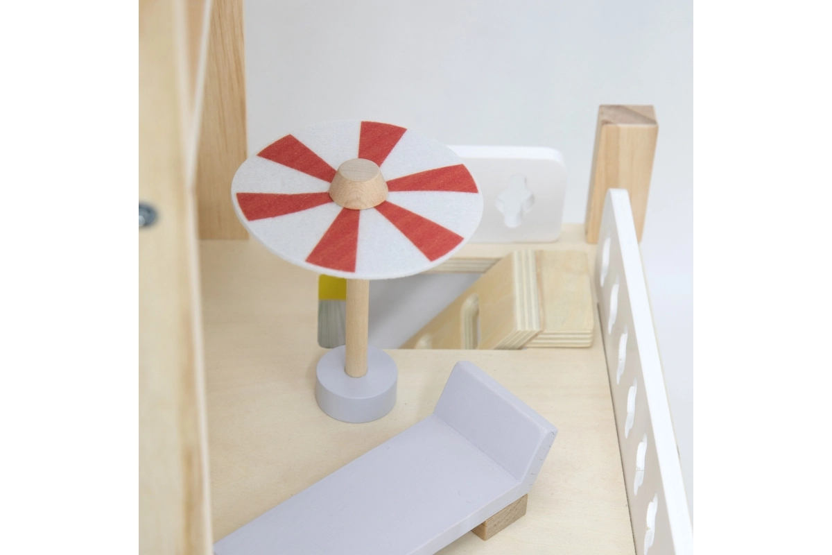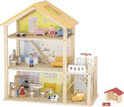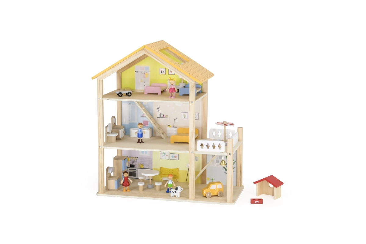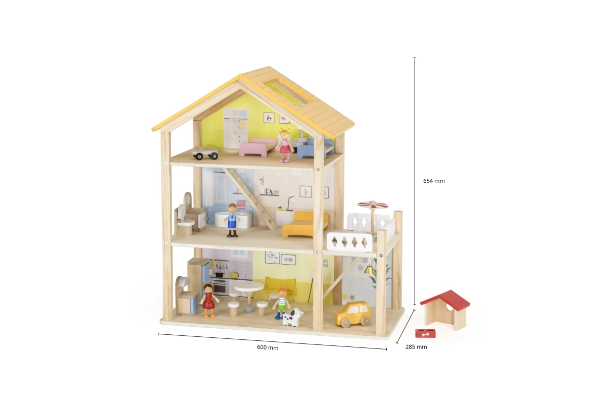 See hoolikalt kujundatud nukumaja pakub kööki koos elutoaga, vannituba, magamistuba, lastetuba, rõdu lamamistooli ja päikesevarjuga ning ka garaaži autoga. Komplekti kuulub mitmekesine mööblikomplekt, 4 figuuri ja koer – kõik valmis kohe mängimiseks.