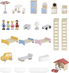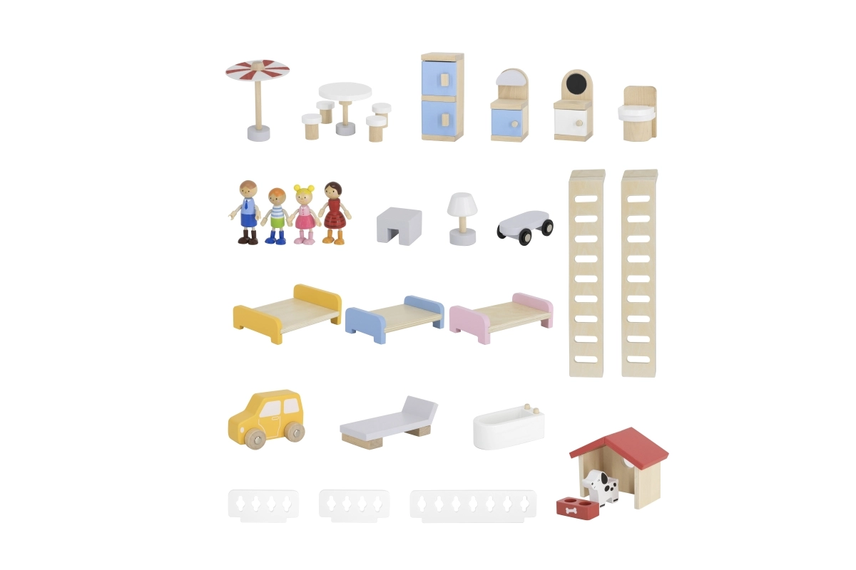 Komplektis on 32 elementi: köögi, elutoa, vannitoa, magamistoa ja lastetoa mööbel, 4 figuuri ja koer.