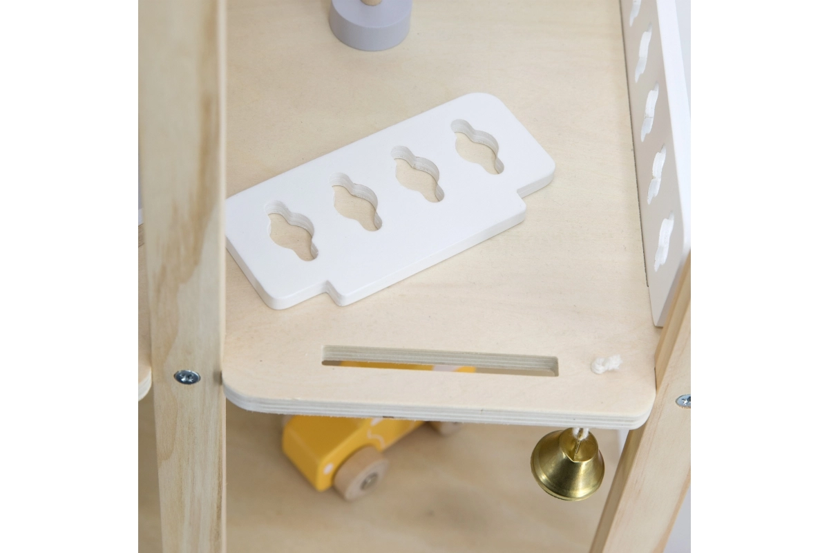 Praktiline garaaž puidust autoga ja muude lisanditega laiendab mänguvõimalusi ja toetab rollimänge.