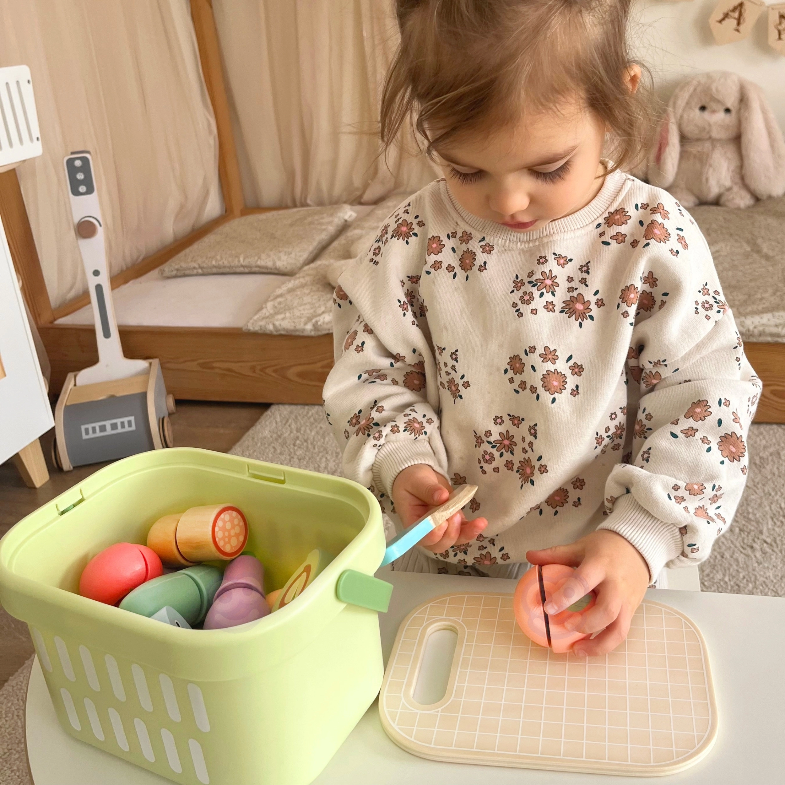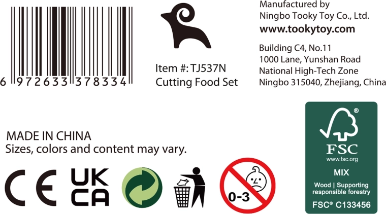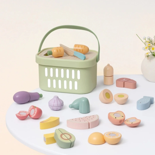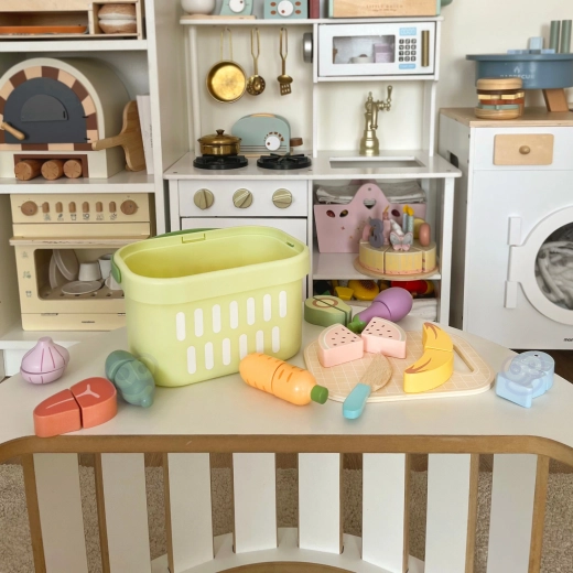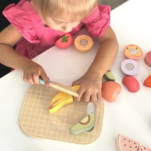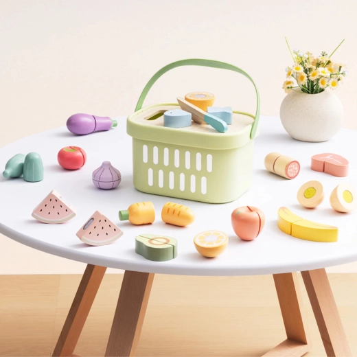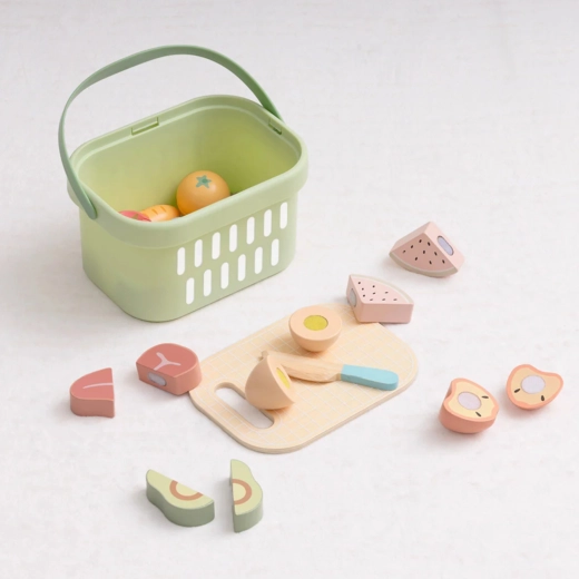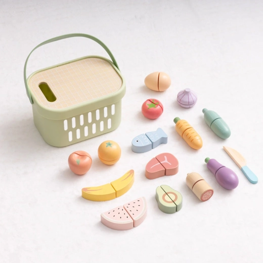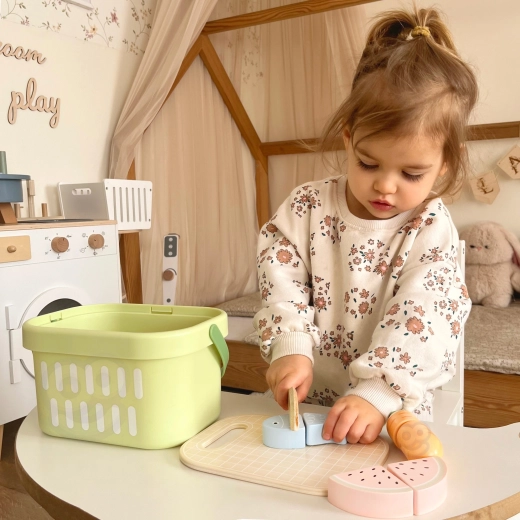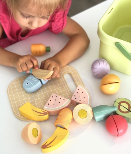 TOOKY TOY puidust toidukomplekt sobib suurepäraselt väikesesse mängukööki. Pastelltoonides puu- ja köögiviljad, kala, steik, juust ja muna on jaotatud osadeks ning ühendatud takjapaelaga – lapsed saavad neid puidust noaga kaasasoleval lõikelaual turvaliselt „lõigata“ ja uuesti kokku panna. Kõik mahub kergesse korvi, mistõttu on komplekt hõlpsasti kaasaskantav ja alati korras.