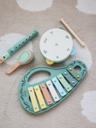 Komplektis on ksülofon, tamburiin, plokkflööt, kastanjett ja pulk – ideaalne kooslus rütmide ja helide avastamiseks juba alates 18. elukuust.