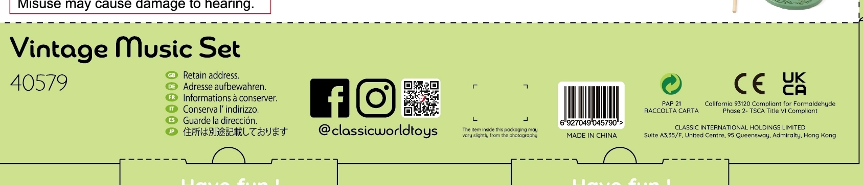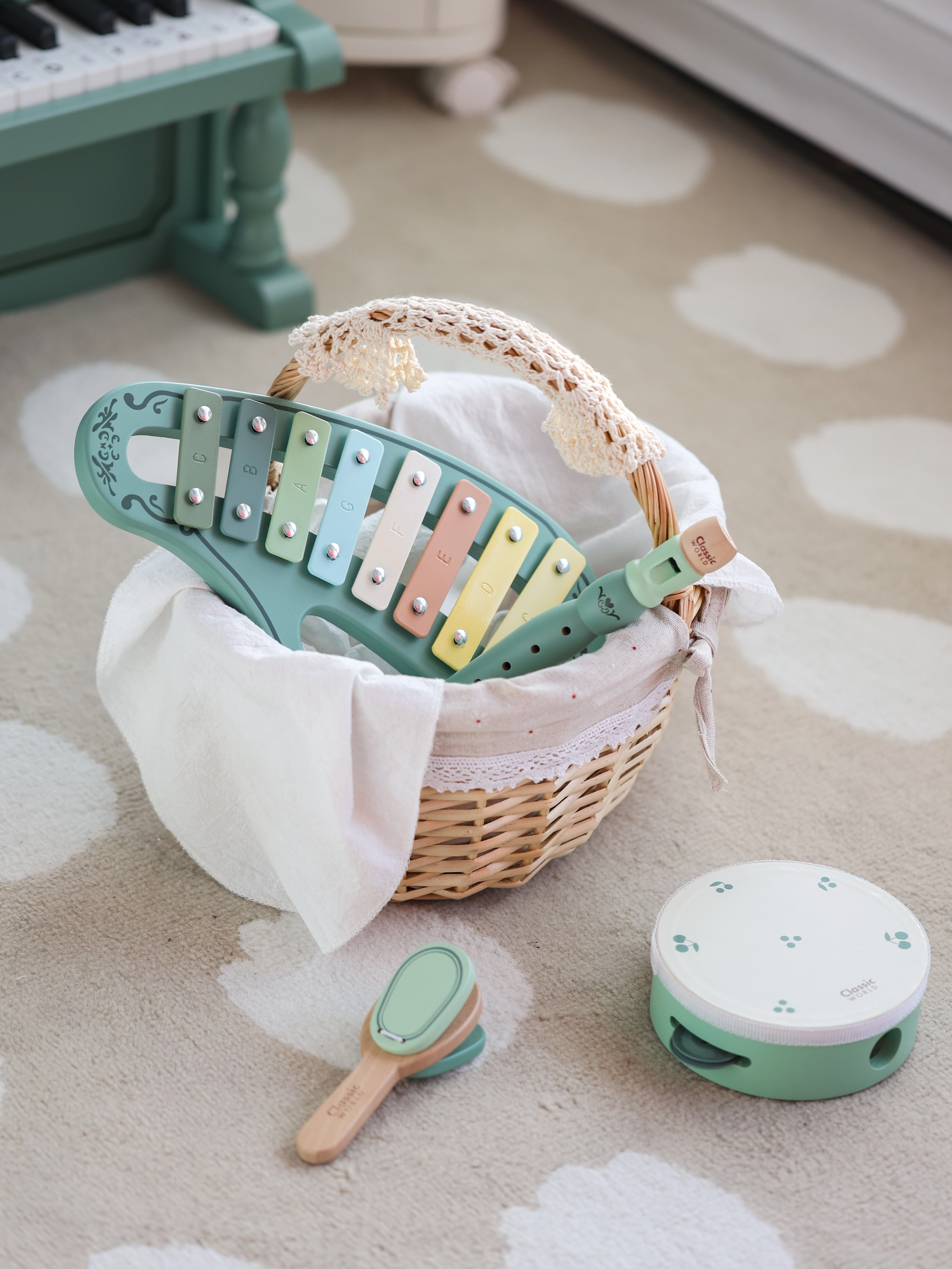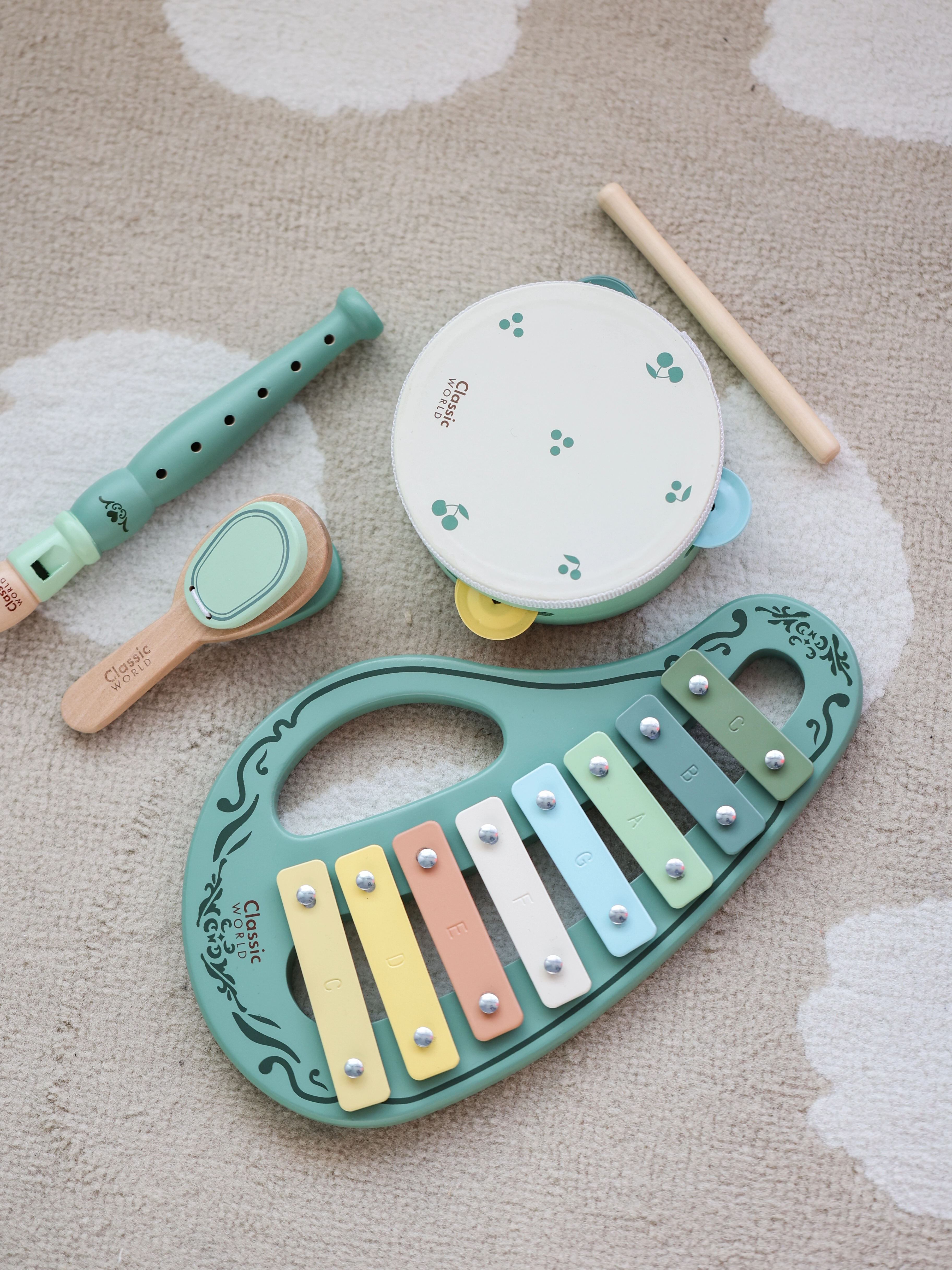 Avasta muusikarõõmu selle puidust vintage muusikariistade komplektiga firmalt CLASSIC WORLD. Pastelsed toonid, kvaliteetne teostus ja ohutud, ümarad servad teevad komplektist ideaalse valiku esimesteks muusikalisteks sammudeks. Arendab loovust, rütmitunnet ja kuulmist ning sobib suurepäraselt kingituseks lastele alates 18. elukuust.