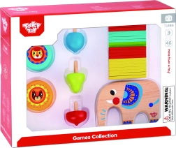 See mitmekesine 46-osaline puidust komplekt ühendab mitu lemmikmängu ühes pakis. Lapsed saavad tasakaalustada pulki elevandi seljal, ehitada torni või “kaevu”, mängida mikadot, harjutada trikke kahe jojoga ning mõõta, kelle vurr pöörleb kauem. Ideaalne nii iseseisvaks mänguks kui ka perevõistlusteks.