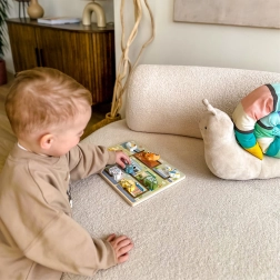 Vastupidav puidust alus, siledad servad ja mittetoksilised värvid. Tükid on jämedamad ja kergesti haaratavad, toetades peenmotoorikat ja käe-silma koostööd.