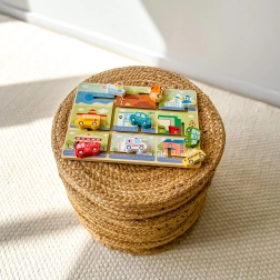 See kvaliteetne puidust labürint linnateemal ja liiklusvahenditega on ideaalne valik alates 18 kuu vanustele lastele. Tugev alusplaat, siledad servad ja intensiivsed, ohutud mittetoksilised värvid tagavad turvalise ja kauakestva mängurõõmu. Lapsed liigutavad üksikuid tükke freesitud radadel ning õpivad, kuhu kuuluvad politseiauto, kiirabi, koolibuss, tuletõrjeauto, laev või lennuk.