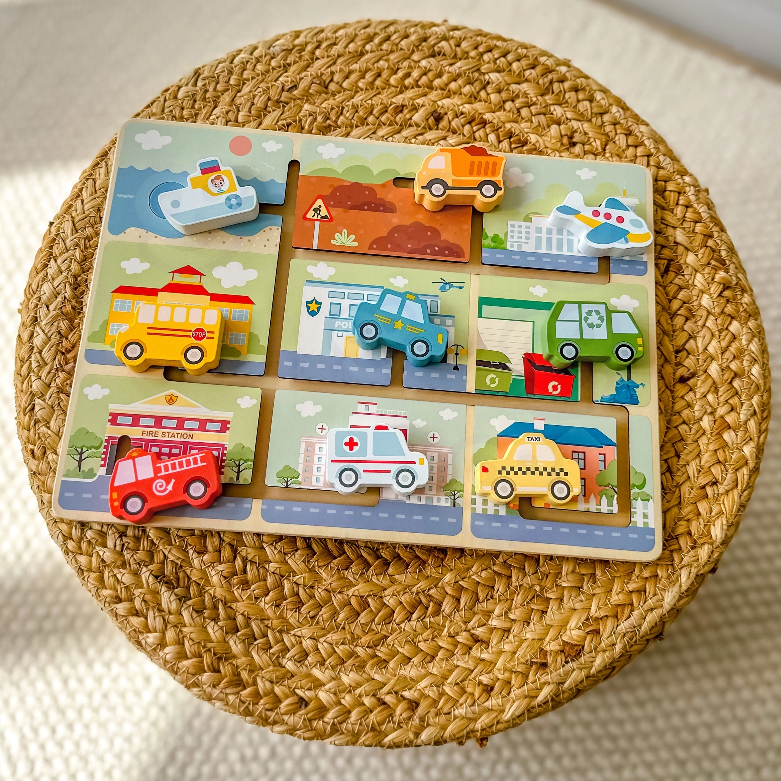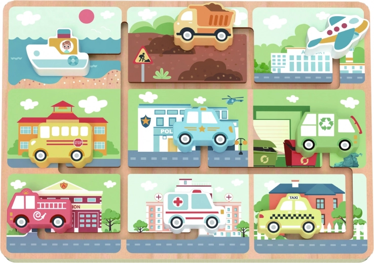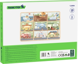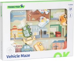 Avasta mänguline puidust mänguasi kõige pisematele – TOOKY TOY sõidukite labürint. Lapsed liigutavad värvilist autokest, bussi, kiirabi või laeva mööda tähistatud radu ja otsivad neile õiged peatuskohad. Arendab peenmotoorikat, käe-silma koordineerimist, loogilist mõtlemist ning liiklusvahendite ja päästeteenistuste tundmist.