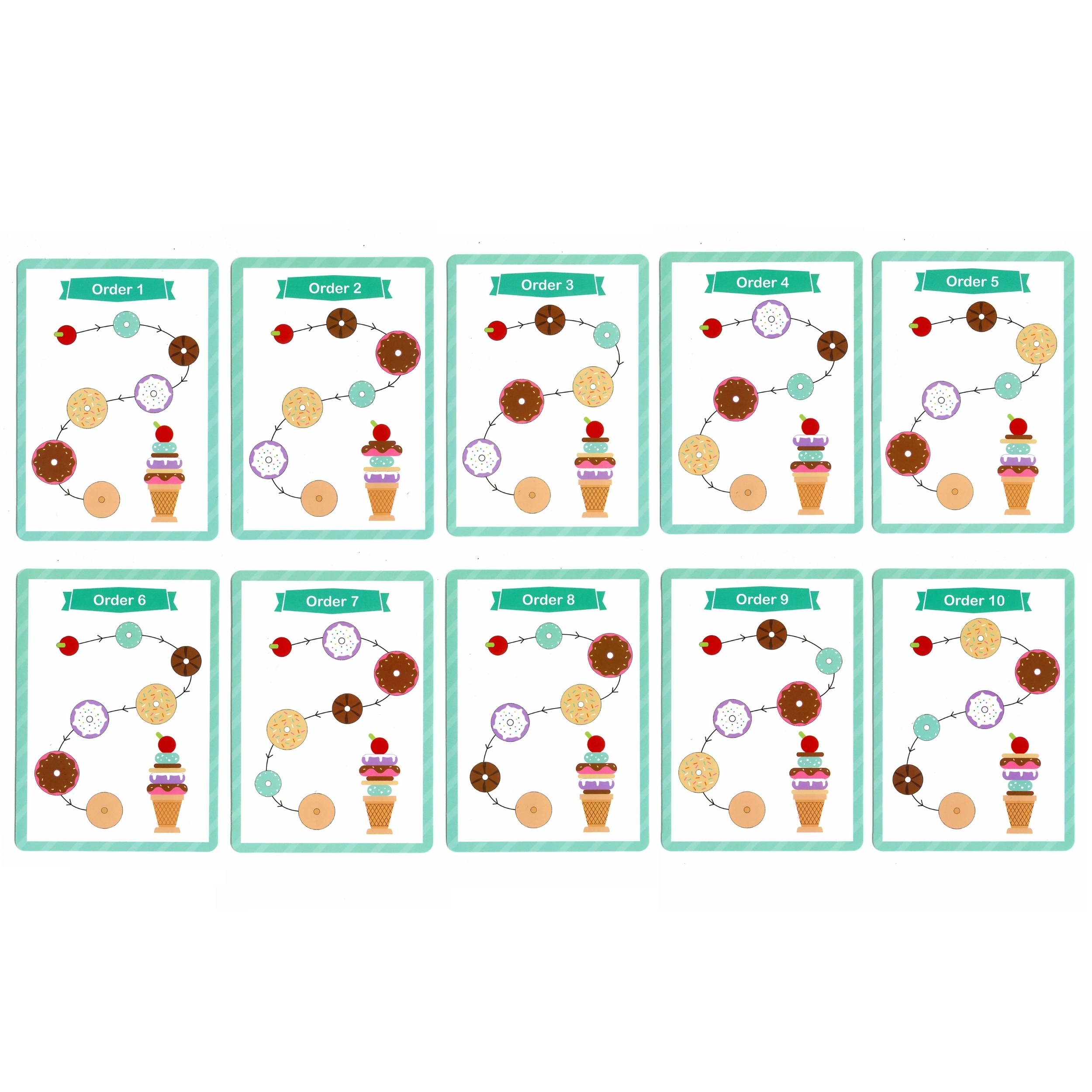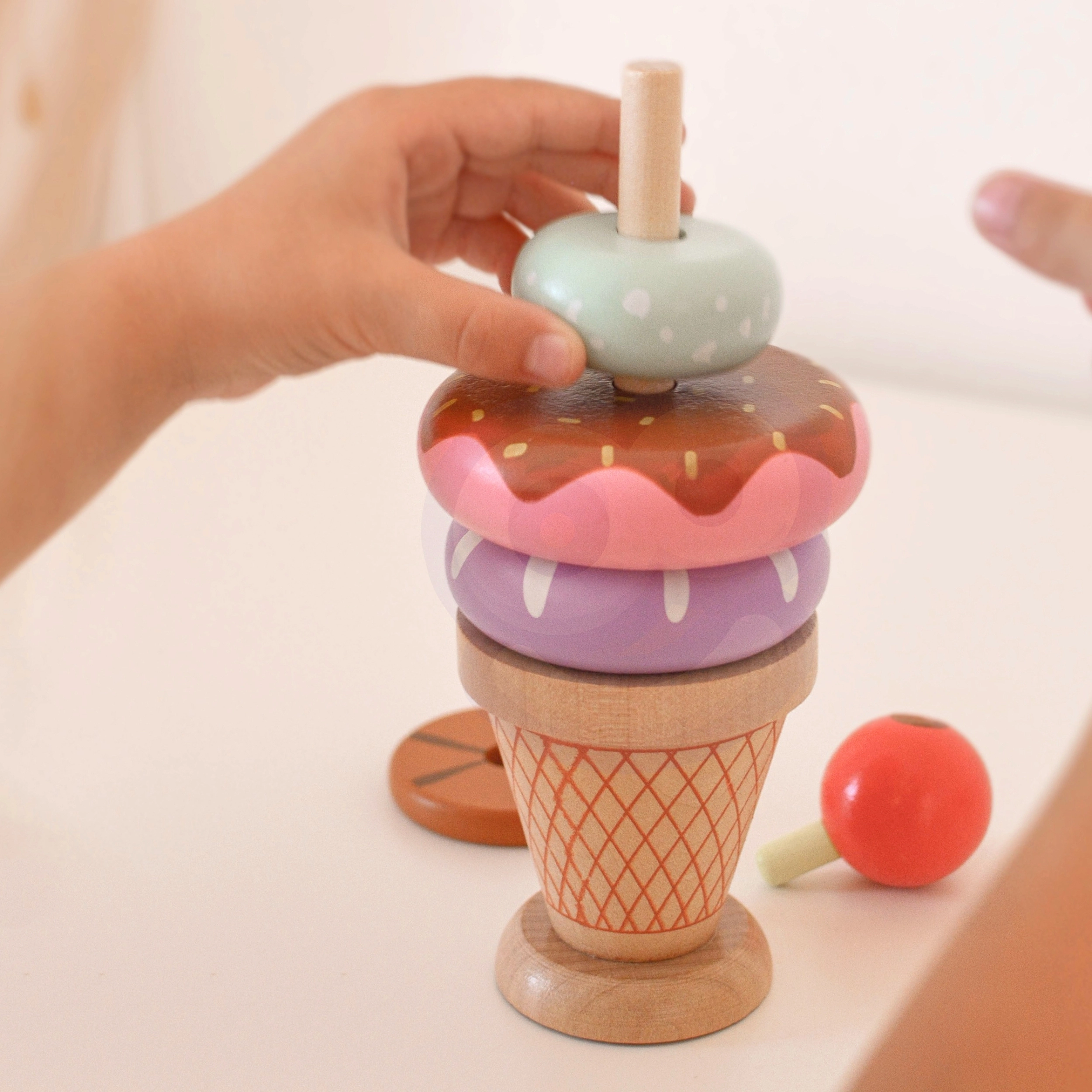 - 12 osa komplektis: erinevad värvilised rõngad ja puidust koonus kirsikesega tipus