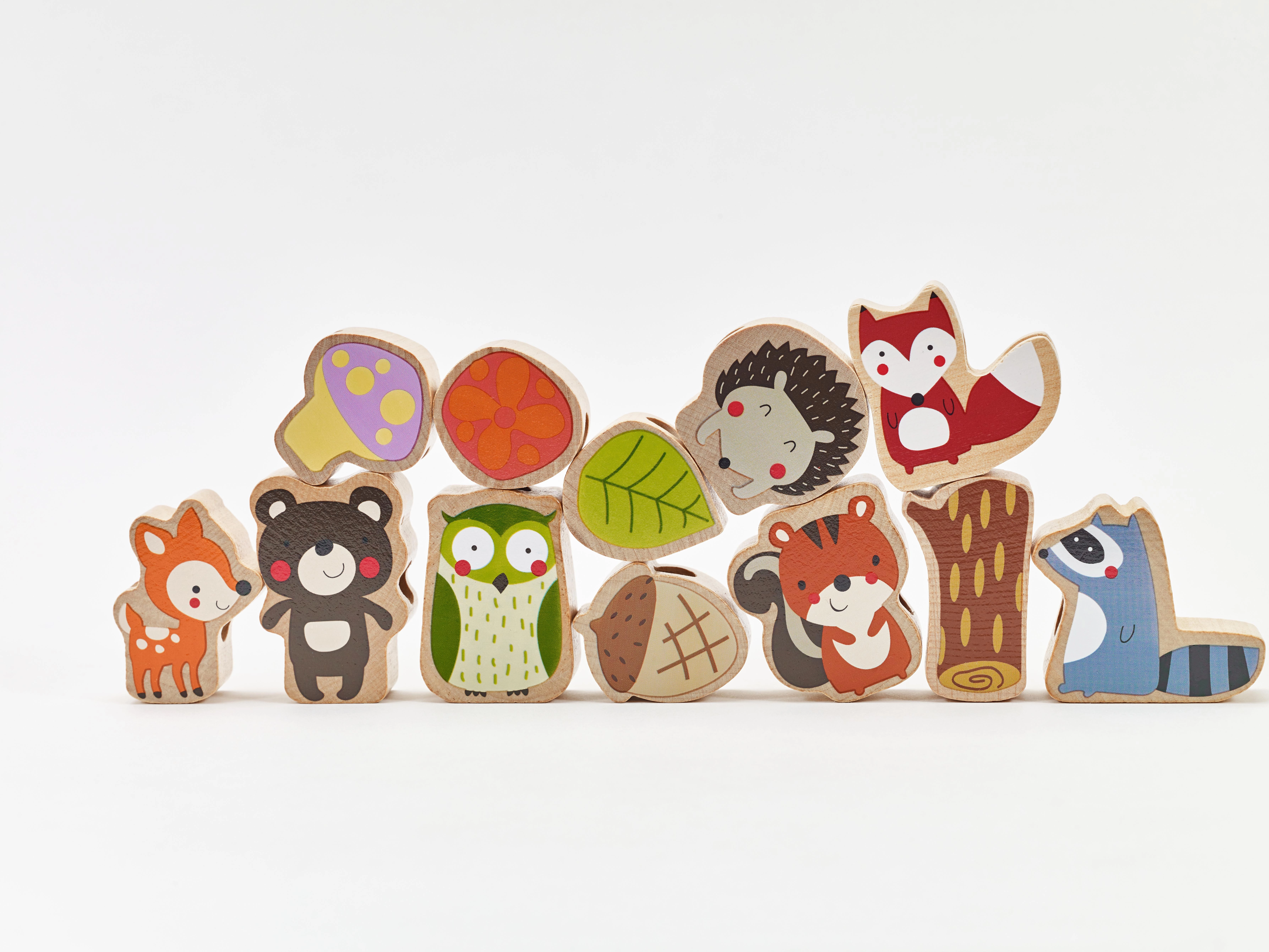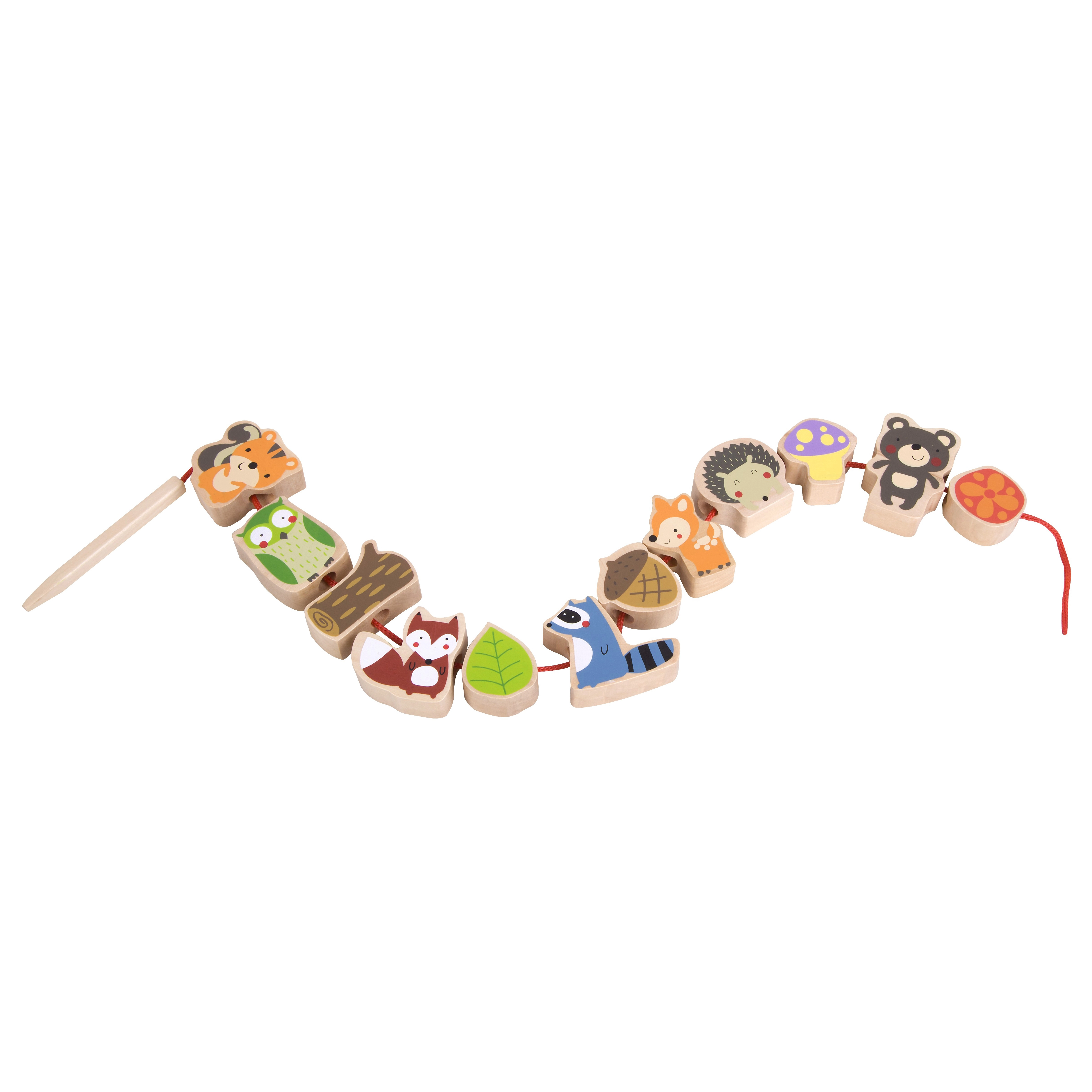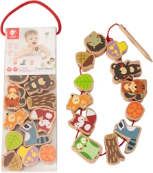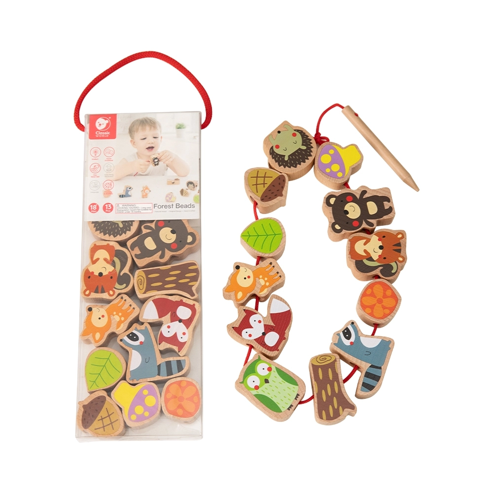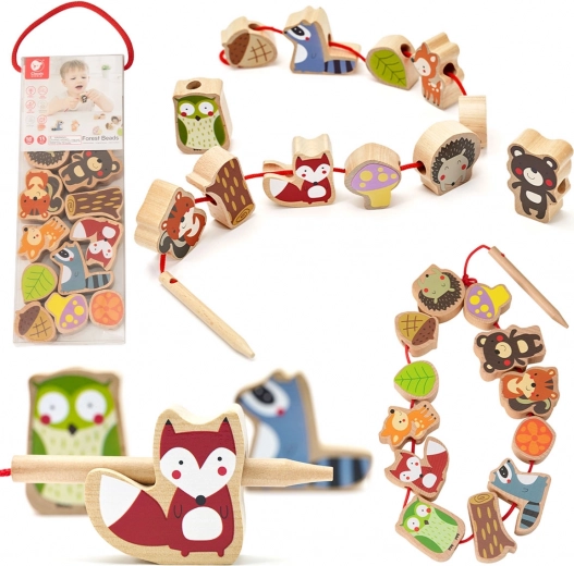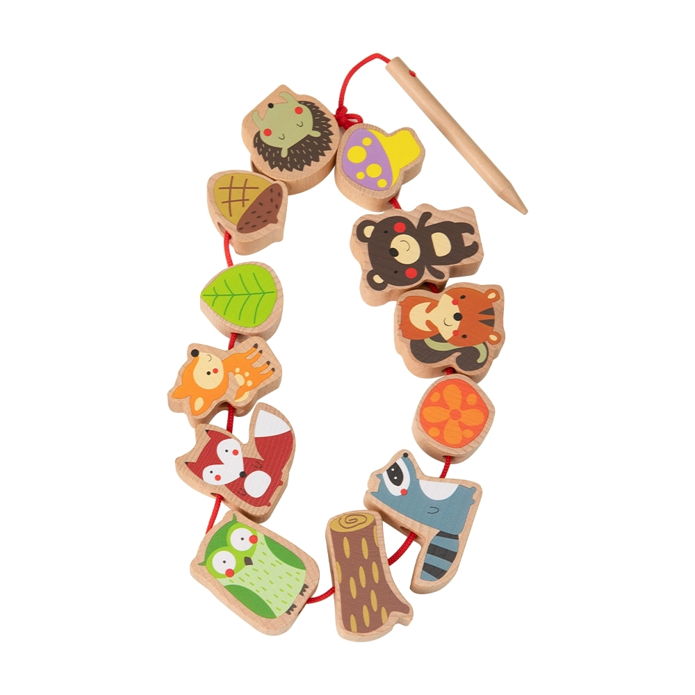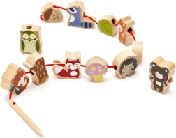 Komplekt sisaldab 12 puidust helmest ja nööri puidust nõelaga. Tükke saab põimida suvalises järjekorras – laps harjutab nii värve, kujundeid kui ka loomade nimetusi ning loob samaaegselt omaenda metsalugusid. Ideaalne valik rahulikuks ja sisukaks ajaviiteks nii kodus kui ka reisil.