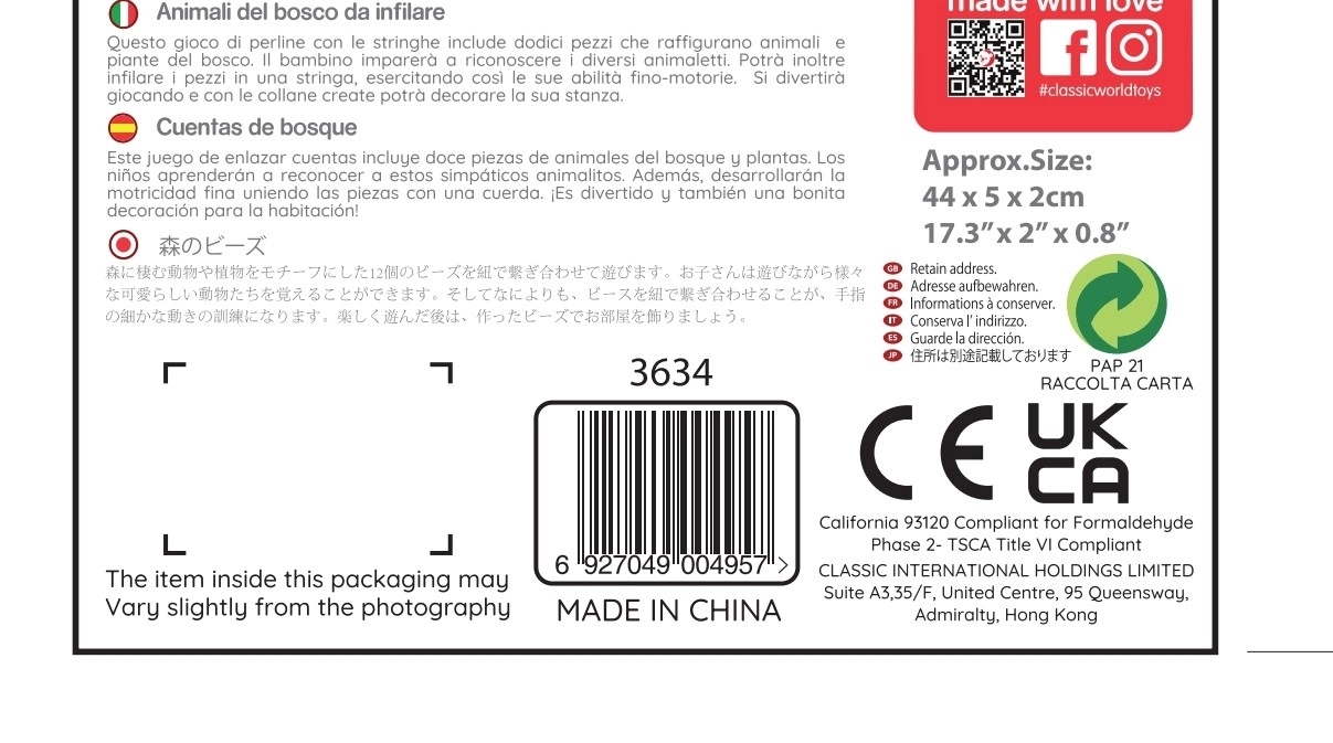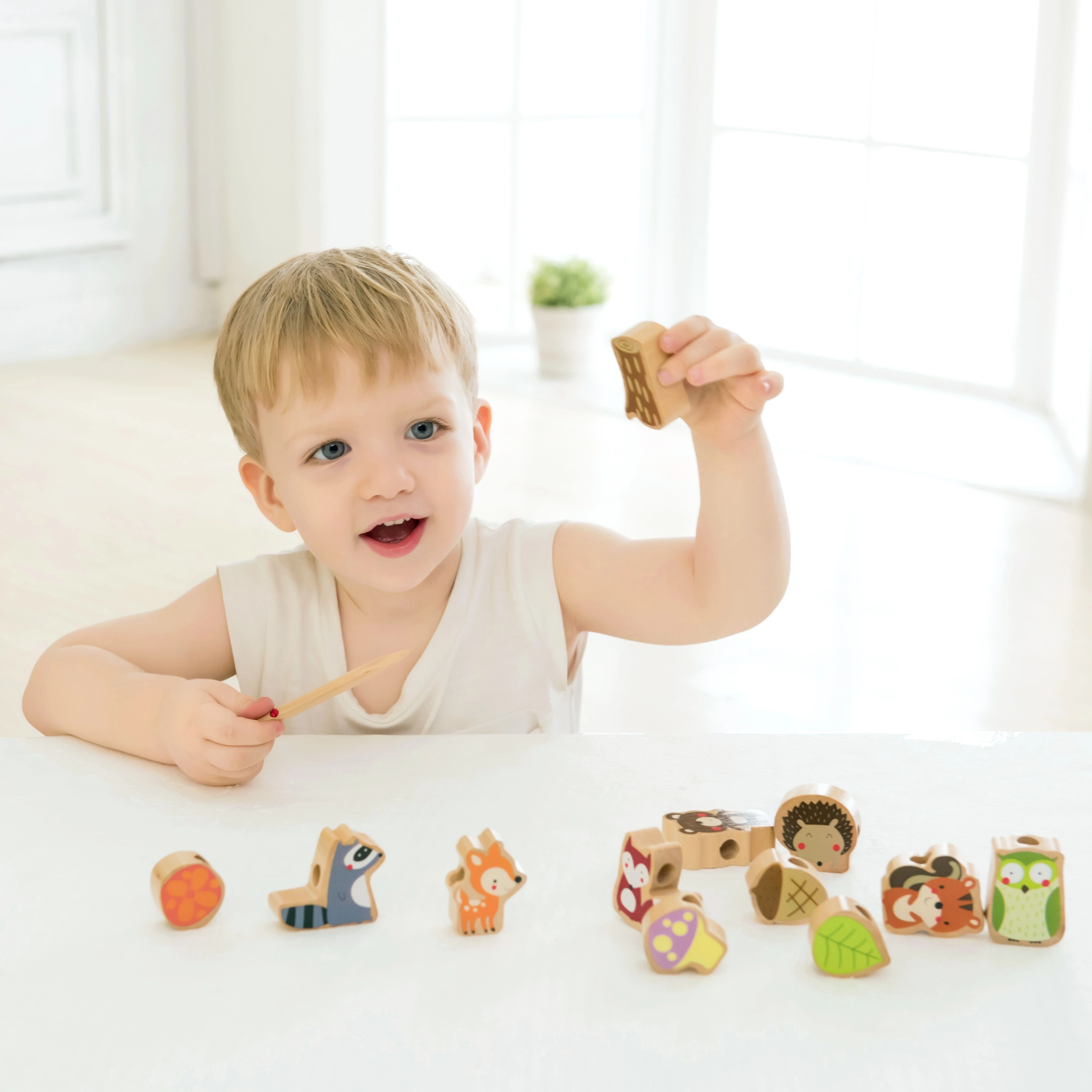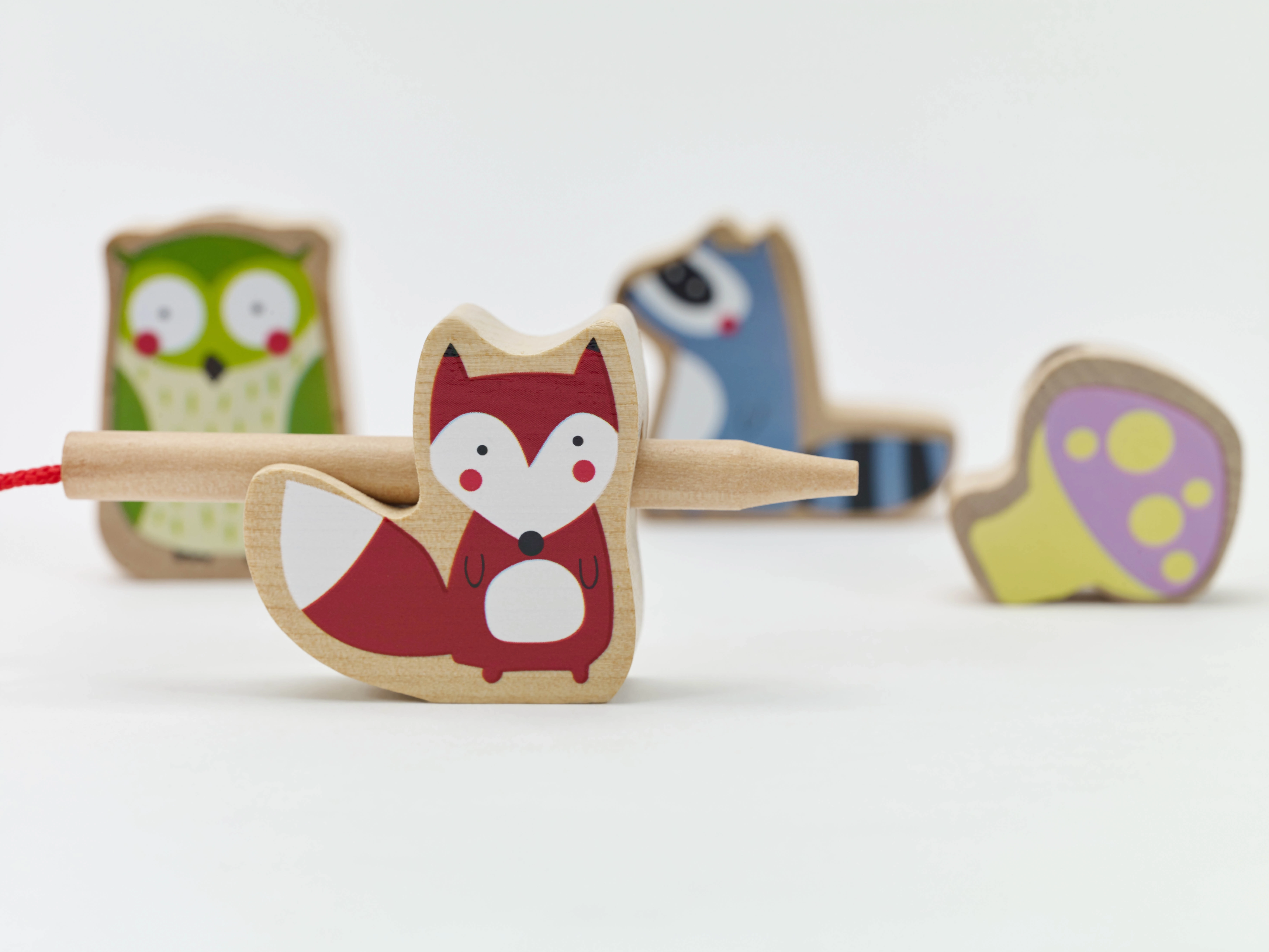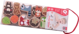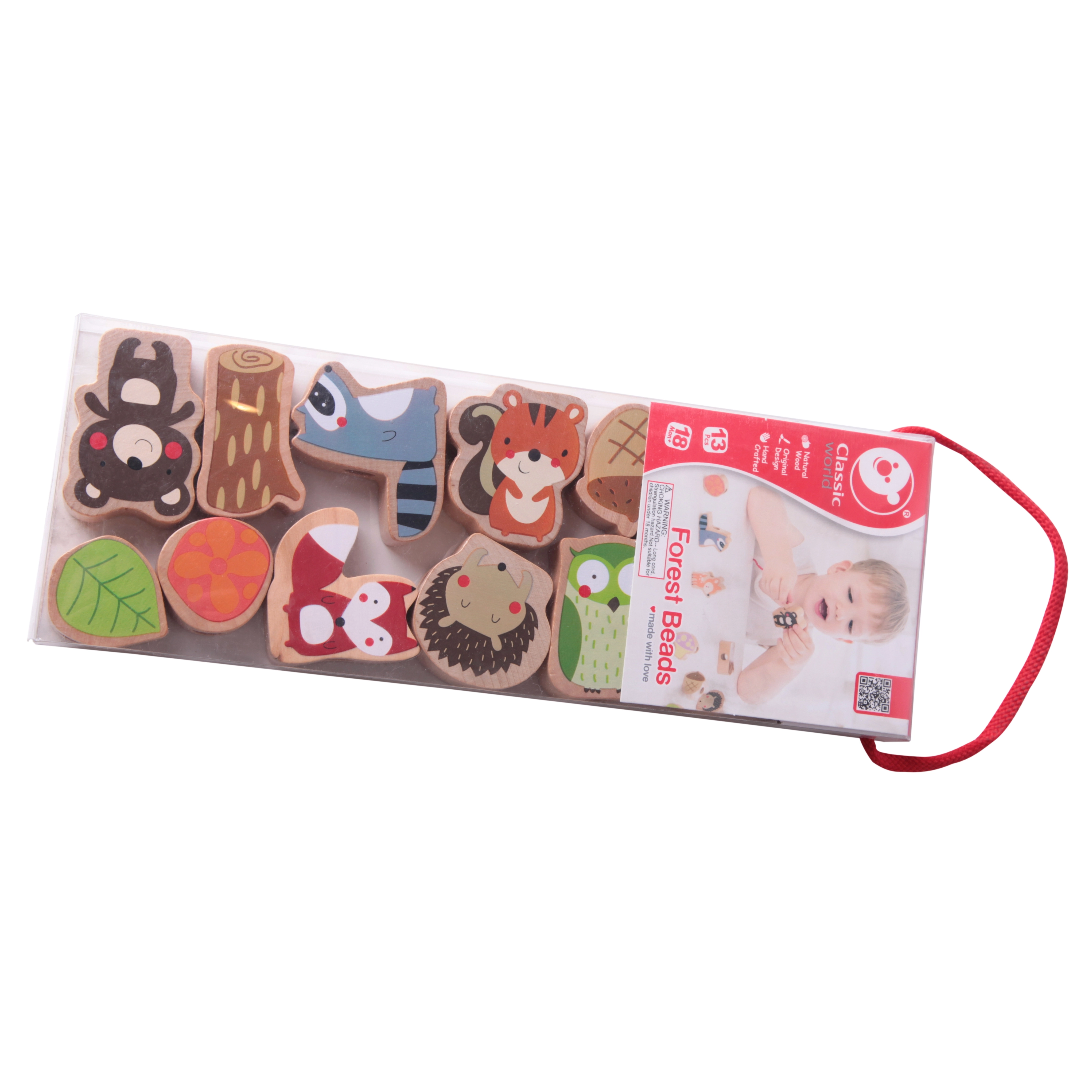 Komplekt sisaldab 12 puidust helmest ja nööri puidust nõelaga. Tükke saab põimida suvalises järjekorras – laps harjutab nii värve, kujundeid kui ka loomade nimetusi ning loob samaaegselt omaenda metsalugusid. Ideaalne valik rahulikuks ja sisukaks ajaviiteks nii kodus kui ka reisil.