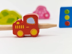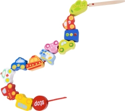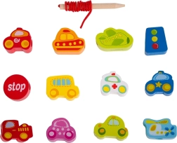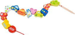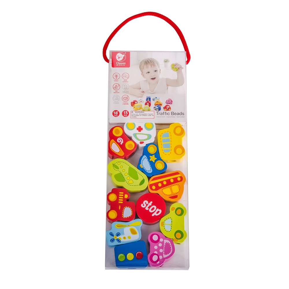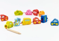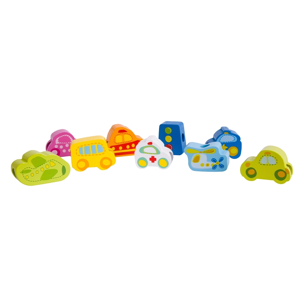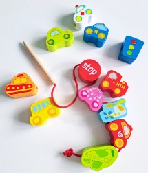 Avastage nutikas mänguasi, mis ühendab õppimise ja lõbu. Puidust helmeid autode, bussi, lennuki ja liiklusmärkide kujul on lihtne lükkida puidust otsikuga nöörile. Mängides harjutavad lapsed peenmotoorikat, liigutuste täpsust ning värvide ja kujundite äratundmist.