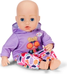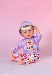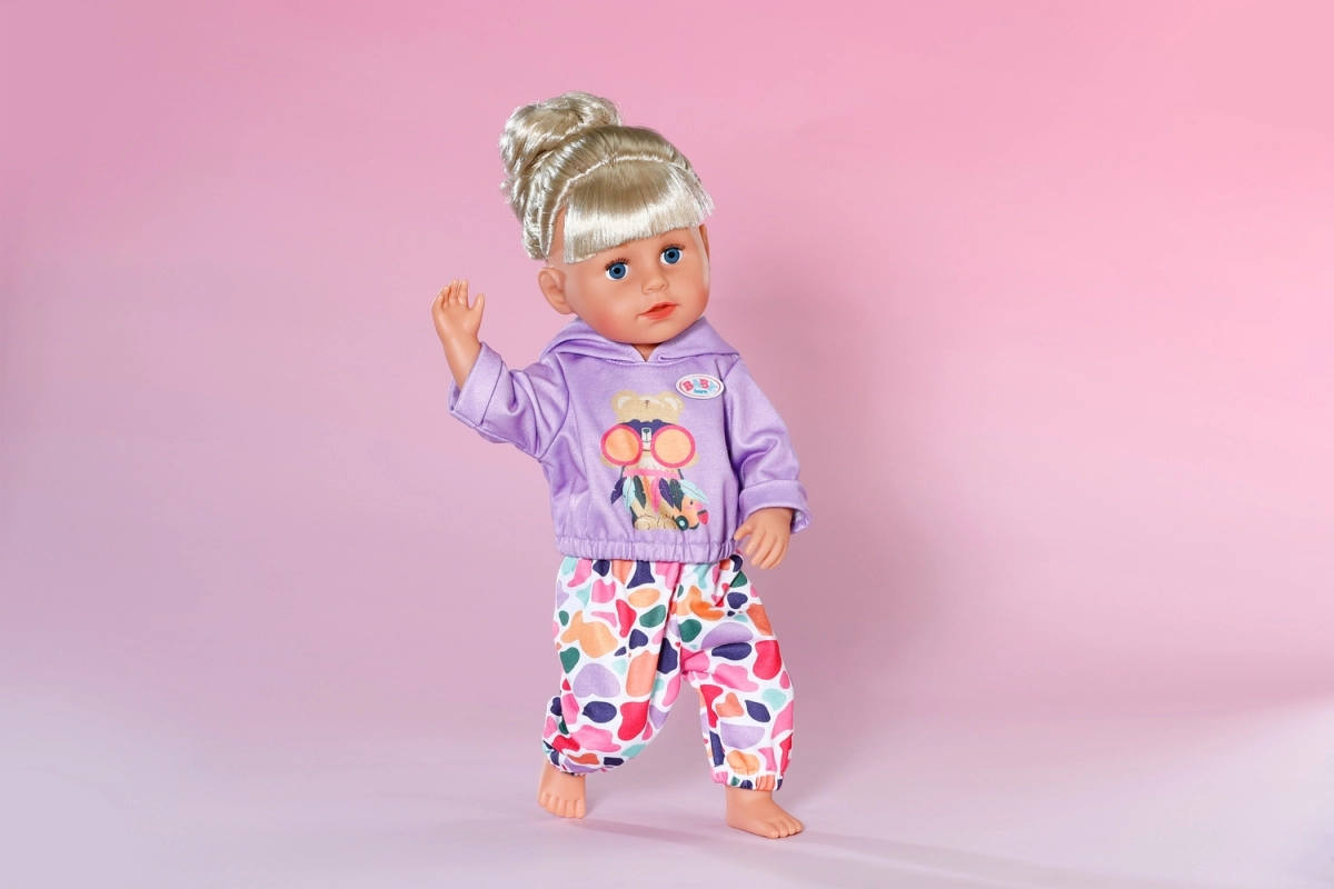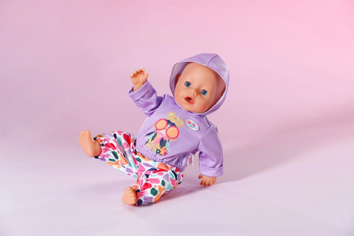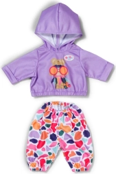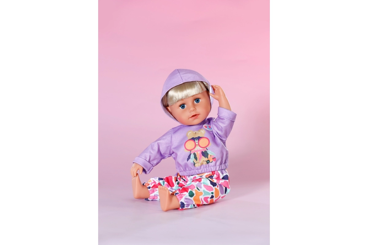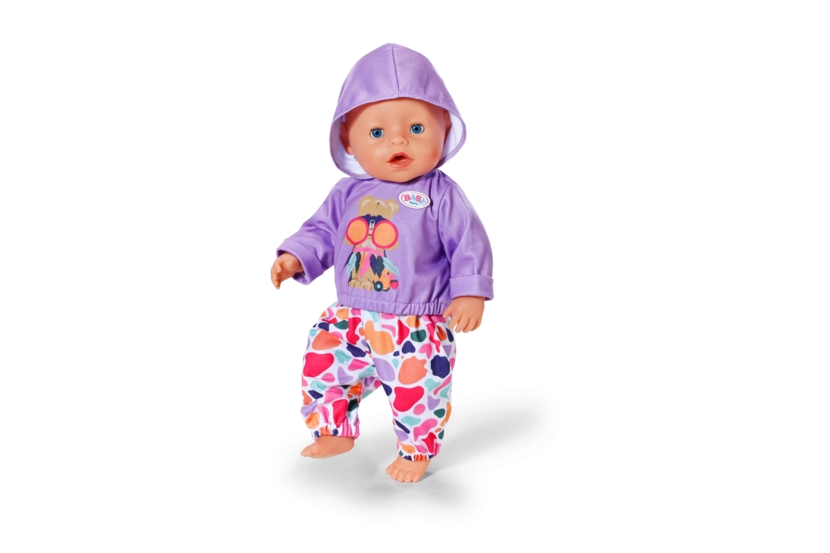 Stiilne komplekt 43 cm nukkudele: lillakas kapuutsiga pusa ja lõbusa mustriga värvilised püksid loovad mängulisi kombinatsioone. Kaasas on ka ümbertöödeldud materjalist riidepuu. Riietus toetab loomingulist mängu, on kergesti selgavatav ja sobib suurepäraselt ka BABY born Teddyle.