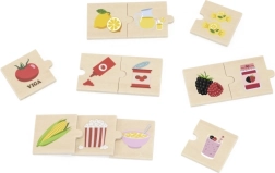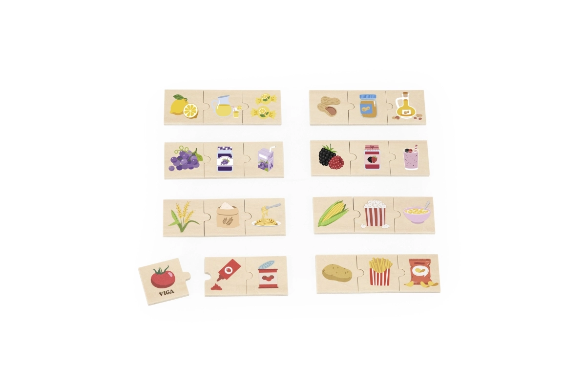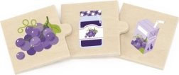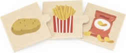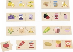 See kvaliteetne puidust komplekt sisaldab lihtsaid puslesid, mis seovad tooraine selle töödeldud tootega. Lapsed õpivad lõbusalt, kust nende lemmikmaiused pärit on – näiteks kartul ja friikartulid, sidrun ja limonaad, mais ja popkorn või viinamarjad ja viinamarjamoos/mahl.