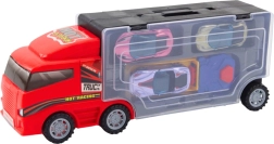 See punane veok garaaži ja väljalaskjaga on suurepärane valik lastele, kes armastavad autosid, võidusõite ja mudelite kogumist. Läbipaistev haagiseosa võimaldab hõlpsalt näha hoiustatud väikeautosid ning lahtrid toetavad korda ja iseseisvat mängu.