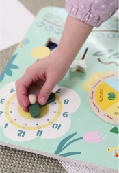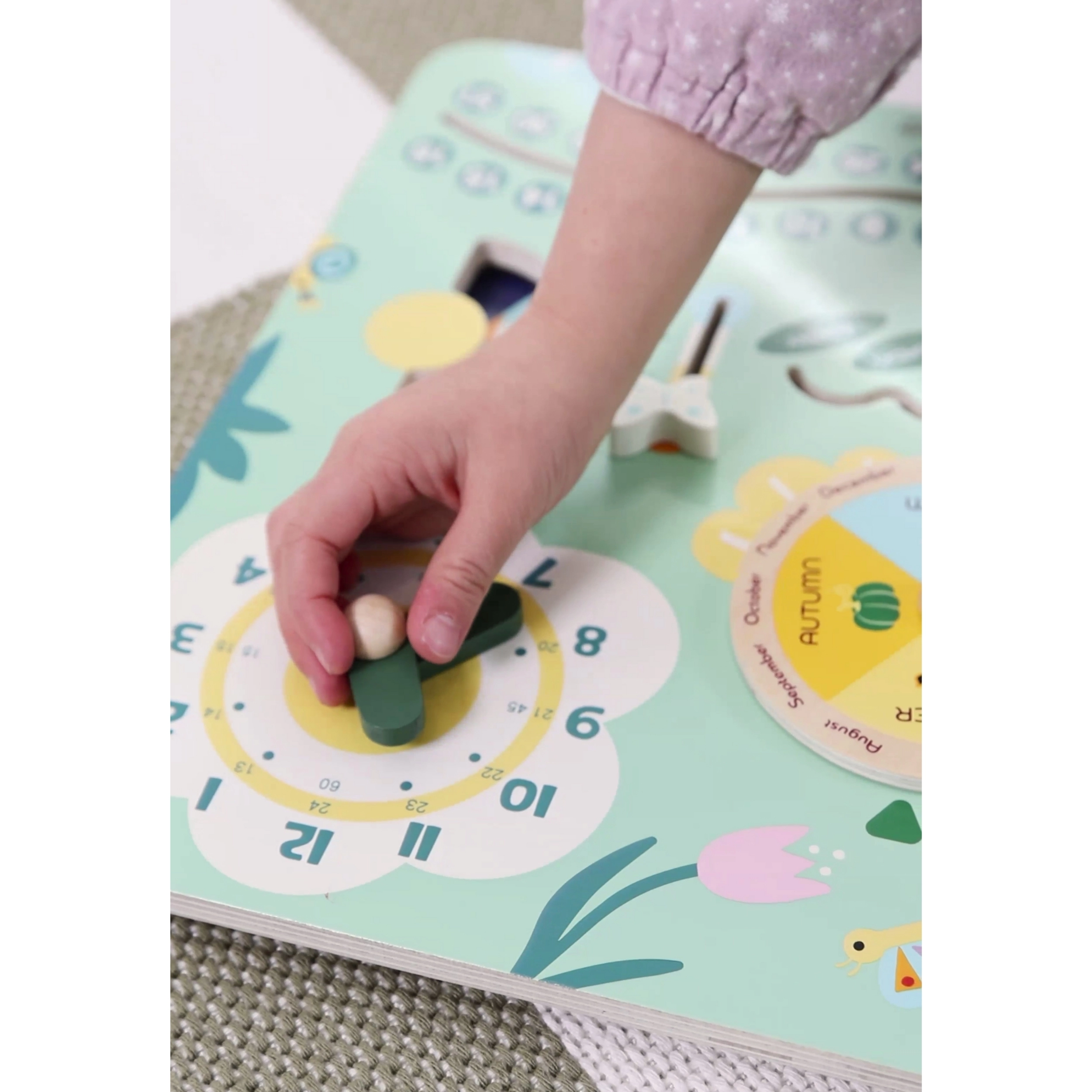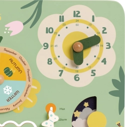 Puidust kalender annab lastele võimaluse iseseisvalt seadistada kuupäeva, kuud ja aastaaega, mis aitab arendada peenmotoorikat.