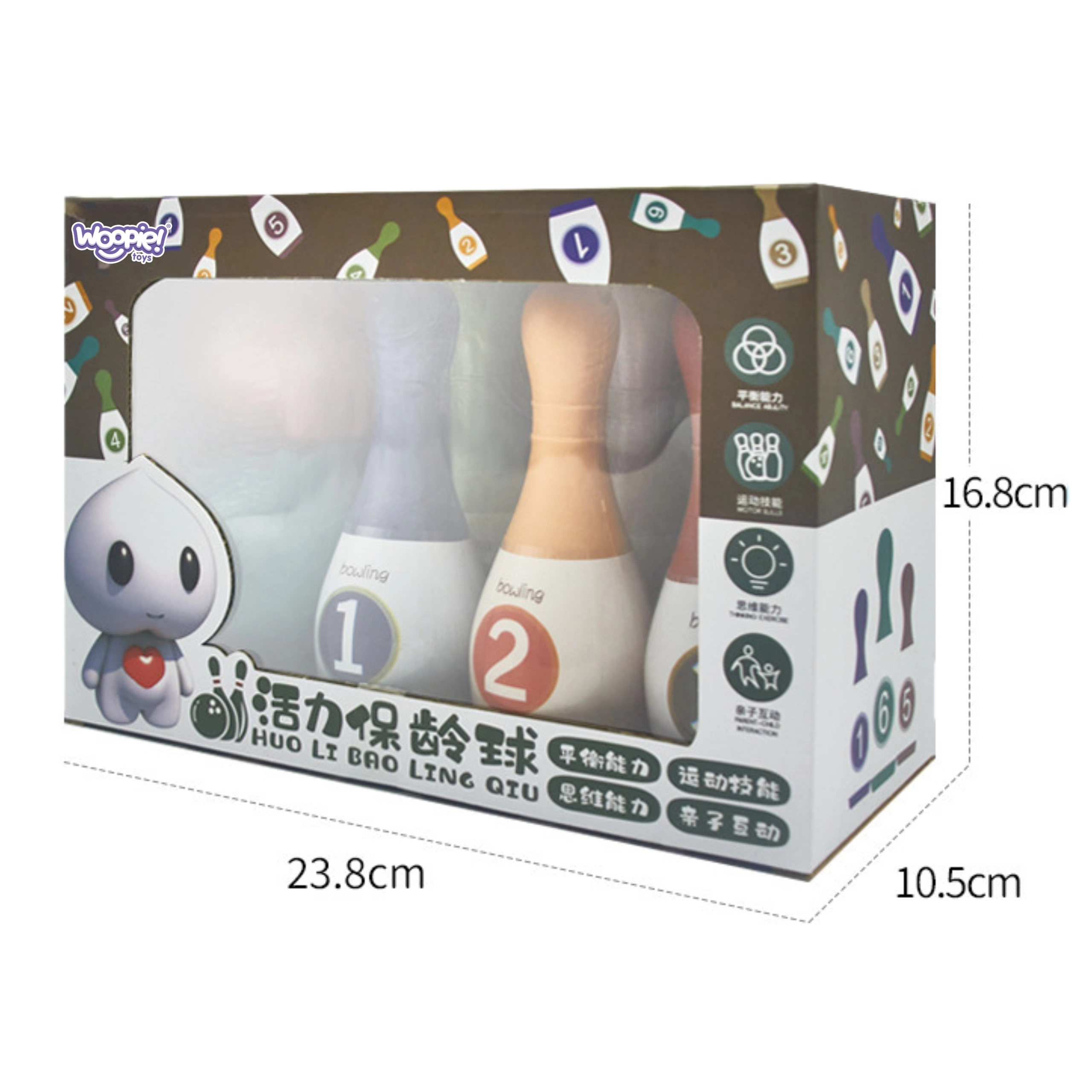 Avastage klassikaline peremäng modernses ja värvilises kuues. Värvilised numbritega WOOPIE keeglikoonused toovad teie koju rohkelt rõõmu ja liikumist. Tänu kergele materjalile ja numbrilisele tähistusele sobivad need suurepäraselt laste esimeseks kokkupuuteks nii bowlingu kui ka numbritega lõbusa mängu kaudu.