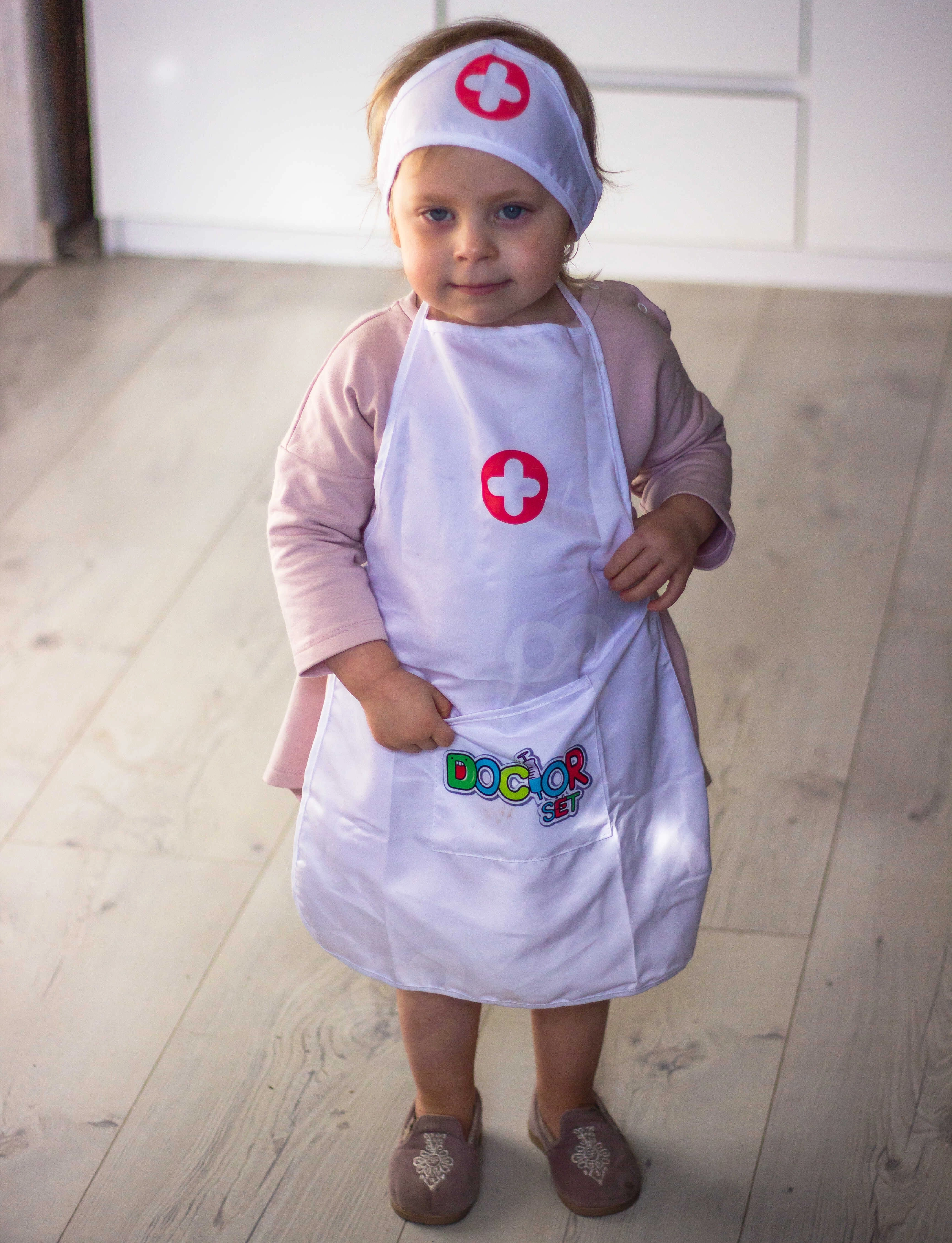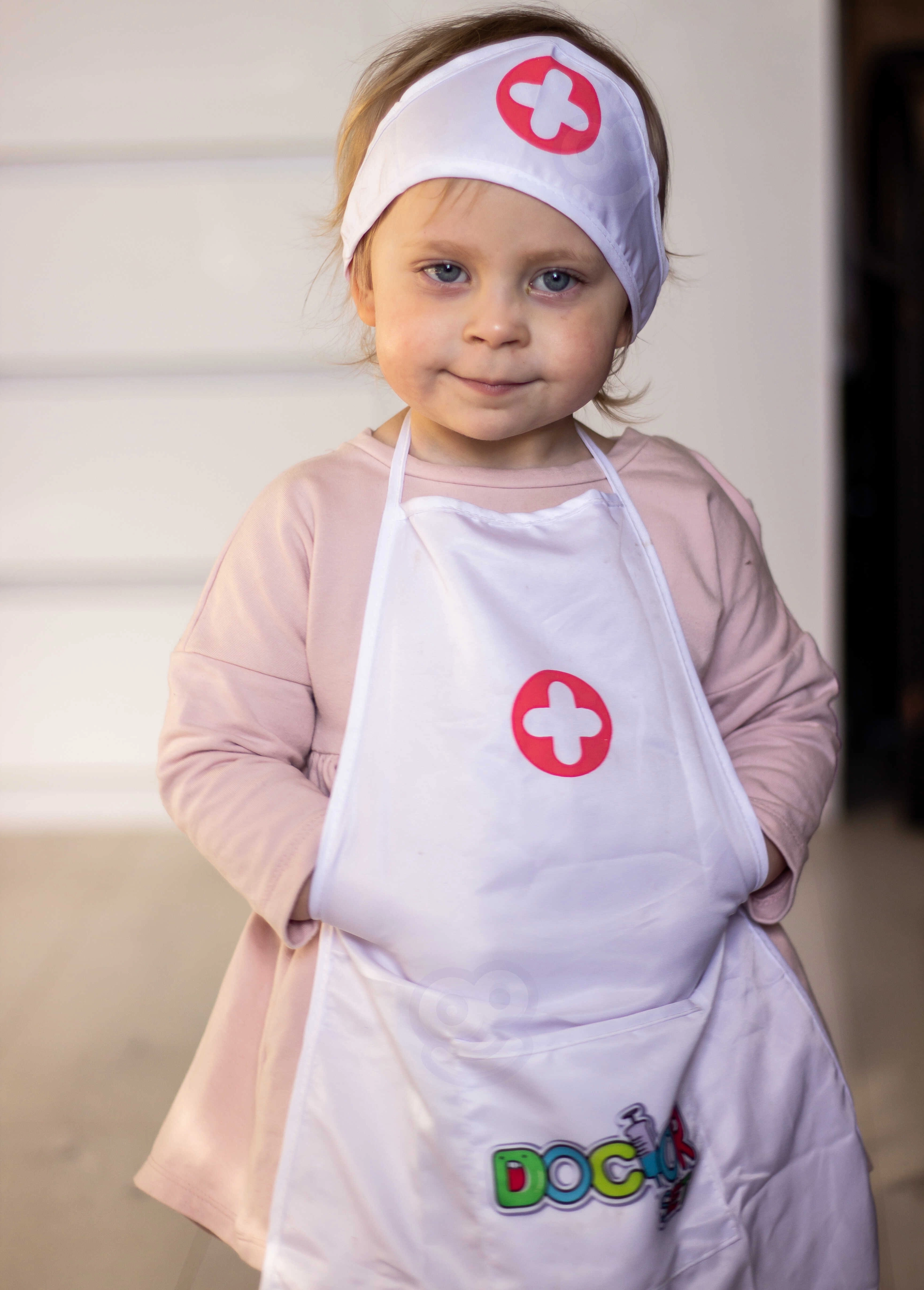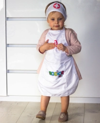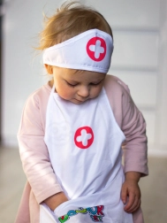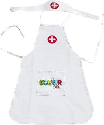 Kerge põll praktiliste taskutega mahutab nii stetoskoobi kui ka muud laste töövahendid, et arstimäng oleks alati käeulatuses.