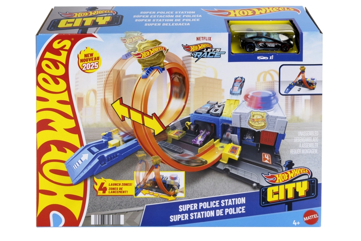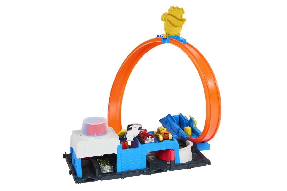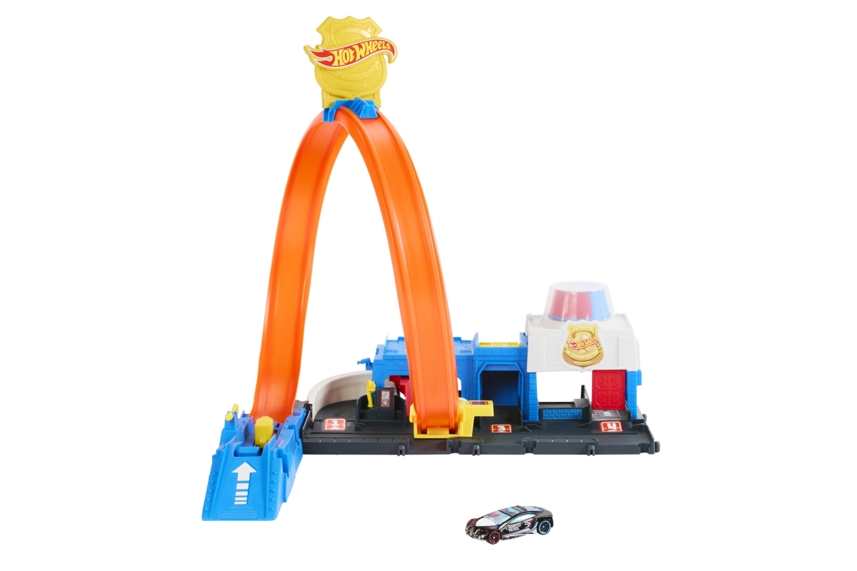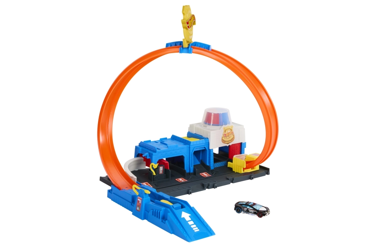 Komplekti kuuluvad kompaktne politseijaoskonna stiilis baas, stardiseade jõulise stardi jaoks ja ikooniline silmus, mis paneb proovile iga väikse auto. Komplekti saab hõlpsasti ühendada teiste HOT WHEELS radadega, et laiendada linna uute väljakutsete, rampide ja takistustega.