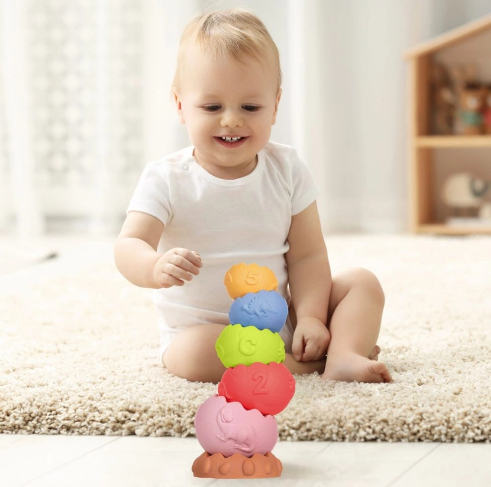 See multifunktsionaalne ehituskomplekt ümarate, tekstuursete osadega õrnades pastelltoonides sobib suurepäraselt esmasteks avastusteks ja sortimiseks. Lapsed saavad osi üksteise peale laduda, haarata, pigistada ning uurida reljeefseid numbreid ja kujundeid, arendades loomulikul moel motoorseid oskusi ja varajast matemaatilist mõtlemist.