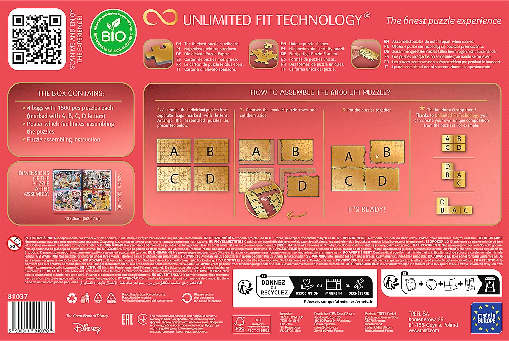 Pane kokku maagiline DISNEY maailm ainulaadse TREFL UFT puslega, kokku 6000 tükki. Pakend sisaldab nelja eraldi pilti, igas 1500 tükki, mida saab tänu tehnoloogiale Unlimited Fit Technology (UFT) omavahel vabalt ühendada üheks suureks kompositsiooniks. Naudi kõrgeimat trükikvaliteeti, tugevaid sinisest papist tükke, lihtsat kokkupandud osade teisaldamist ja ökopakendit ilma plastkileteta.