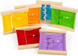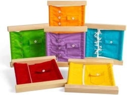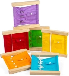 See mitmevärviline õppekomplekt on inspireeritud Montessori meetodist ja soodustab laste iseseisvust. Lõbusal viisil harjutatakse silma-käe koordinatsiooni, tugevdatakse kannatlikkust, keskendumisvõimet ja probleemilahendust. Iga raam simuleerib päris elu riietumissituatsioone.