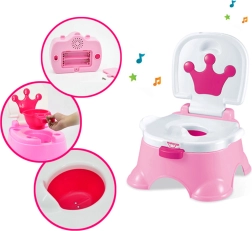 Praktiline WOOPIE 3‑ühes laste pott kiirendab ja muudab WC‑treeningu meeldivamaks. See pakub ühes tootes potti, astmelauda ja istet, sellel on lai ergonoomiline iste, külgmised käepidemed stabiilsuseks ning meloodiad lapse motiveerimiseks. Valmistatud kvaliteetsest ja ohutust plastist, lihtne puhastada ning stabiilse aluse tõttu turvaline igapäevaseks kasutamiseks.
