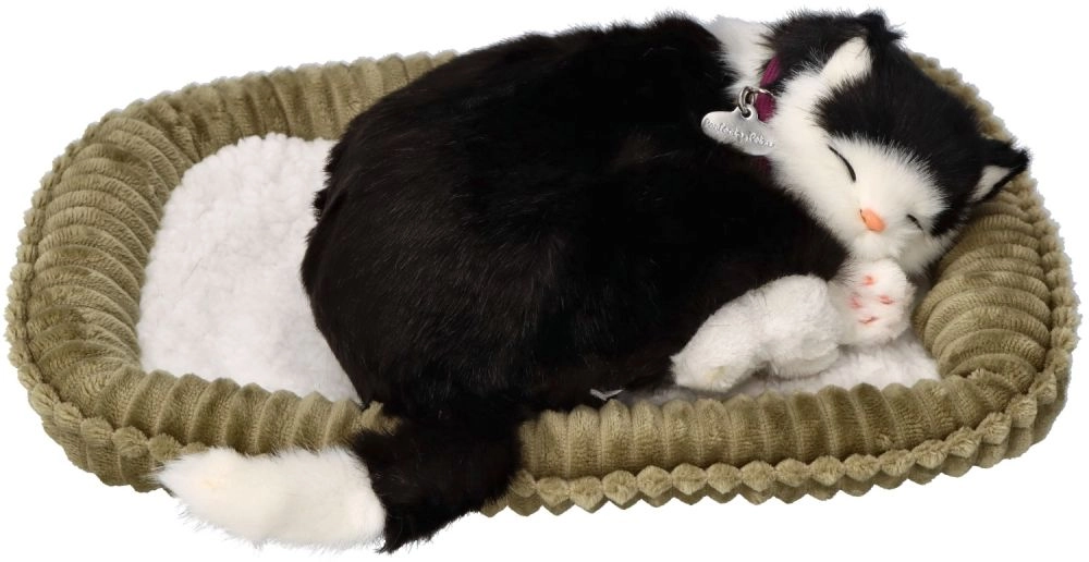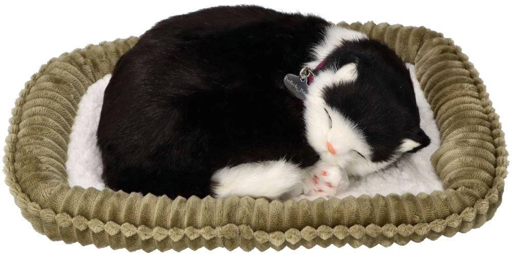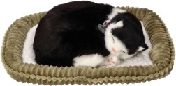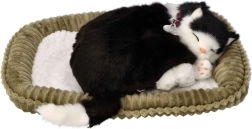 Mustvalge karvkate, sildiga kaelarihm ja magamisasend mõjuvad erakordselt realistlikult – ideaalne nii dekoratsiooniks kui ka kingituseks.