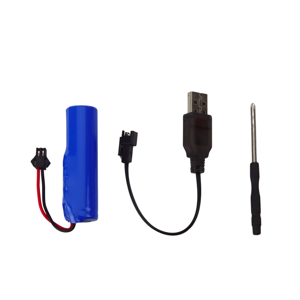 Komplektis on 3,7 V liitiumioonaku, USB-kaabel mugavaks laadimiseks ja väike kruvikeeraja kiireks juurdepääsuks kambrile.
