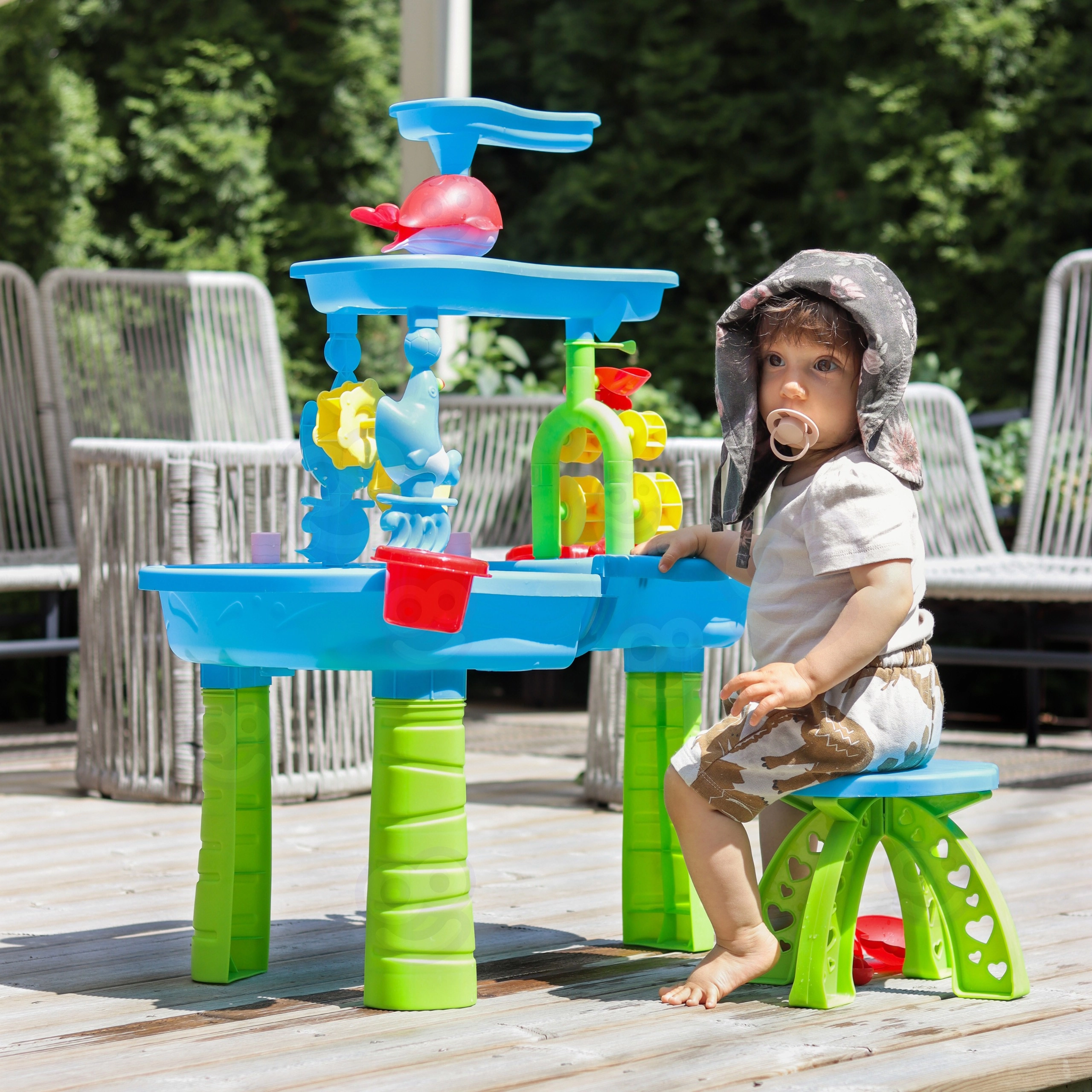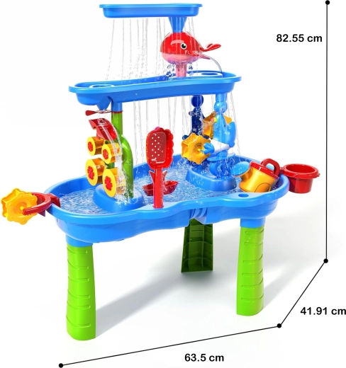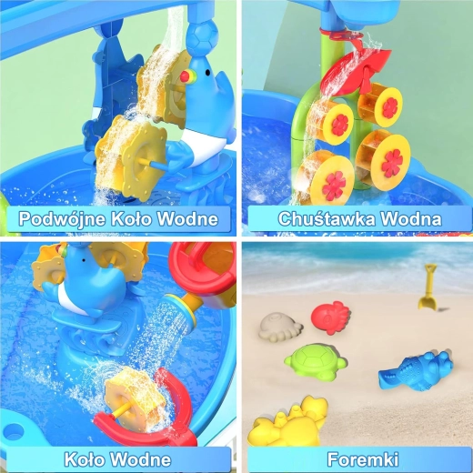 WOOPIE XL vee- ja liivalaud pakub lastele aastaringset lõbu – suvel jahutavad veemängud, jahedamal ajal loovtegevused tavalise või kineetilise liivaga. Tänu 3-korruselisele kaskaadisüsteemile valavad lapsed vett ülemisse anumasse ja jälgivad, kuidas vool paneb veerattad ja veskid pöörlema ning suundub alumistesse vannikestesse. Komplekti kuuluvad ka taburet ja lai valik tööriistu mänguks ja katsetusteks.