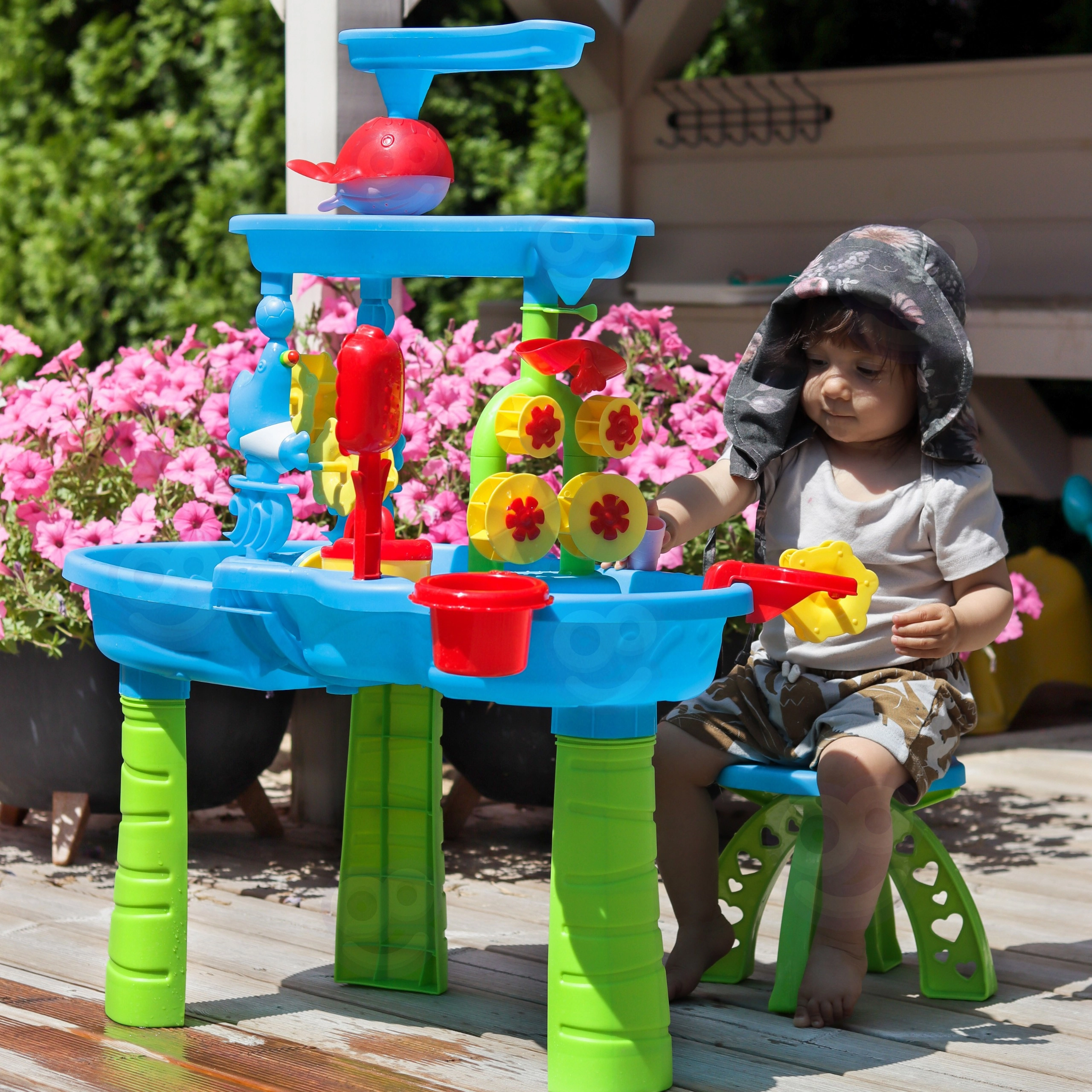 Vala vesi ülemisse anumasse ja vaata, kuidas see voolab läbi rennide, paneb rattad pöörlema ning kutsub lapsi avastama põhjus-tagajärg seoseid.