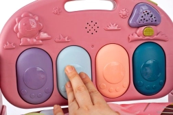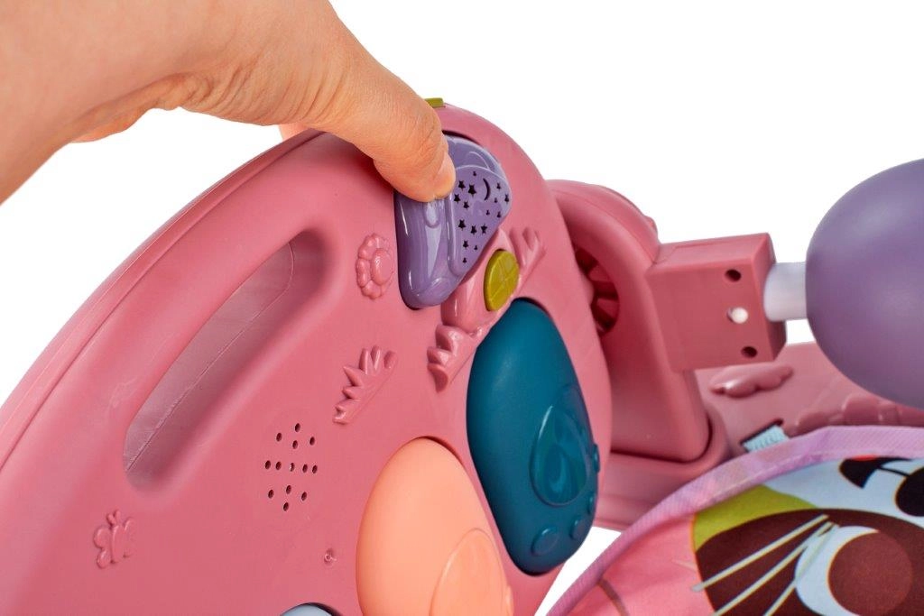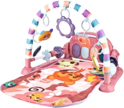 See roosa hariv mängualus loob turvalise ja stimuleeriva koha igapäevaseks mänguks. Värviline rippkaar mänguasjadega julgustab beebit sirutama ja haarama, mis arendab silma–käe koostööd. Interaktiivne klaver valgustatud klahvidega pakub 3 helirežiimi – heliredeli Do–Re–Mi–Fa toonid, lühikesed helid (nt lapse naer) ja pikemad meloodiad – ning toetab kuulmise ja rütmitaju arengut.