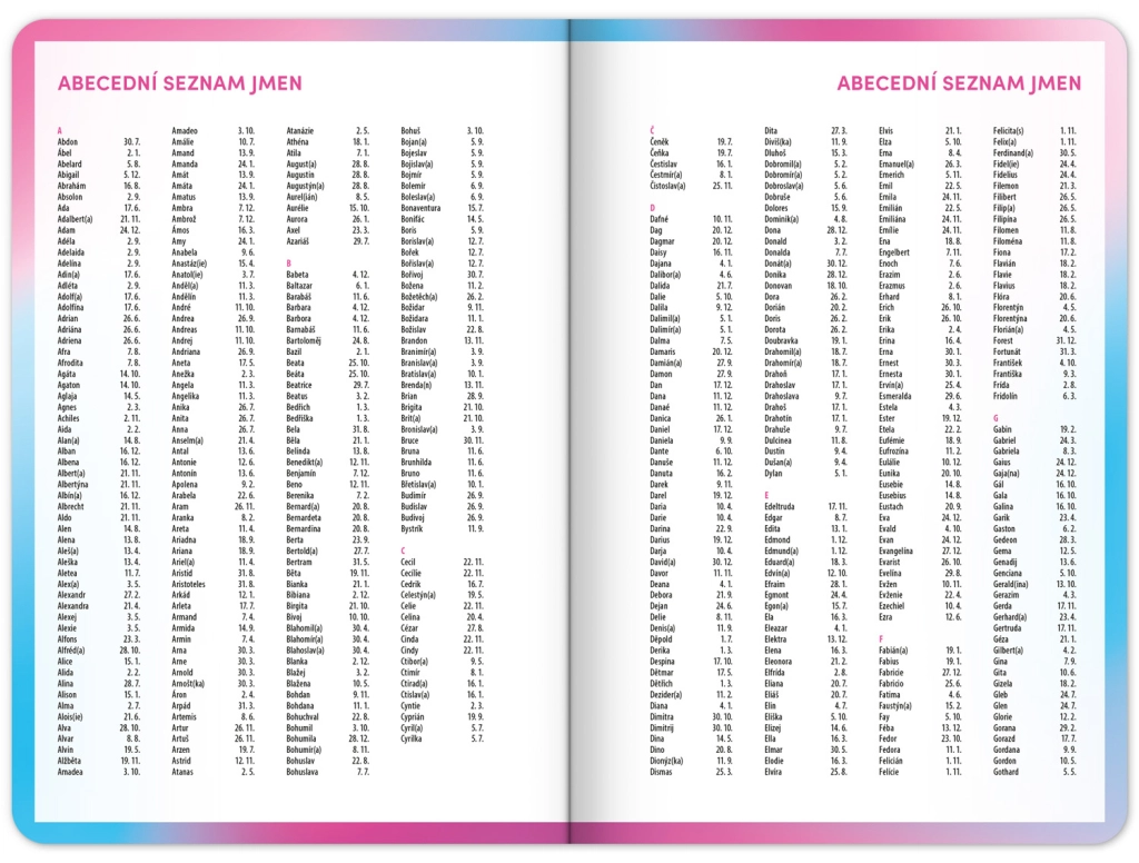 - Tšehhikeelne nädalaridadega kalendrium koos nimede ja pühadega.