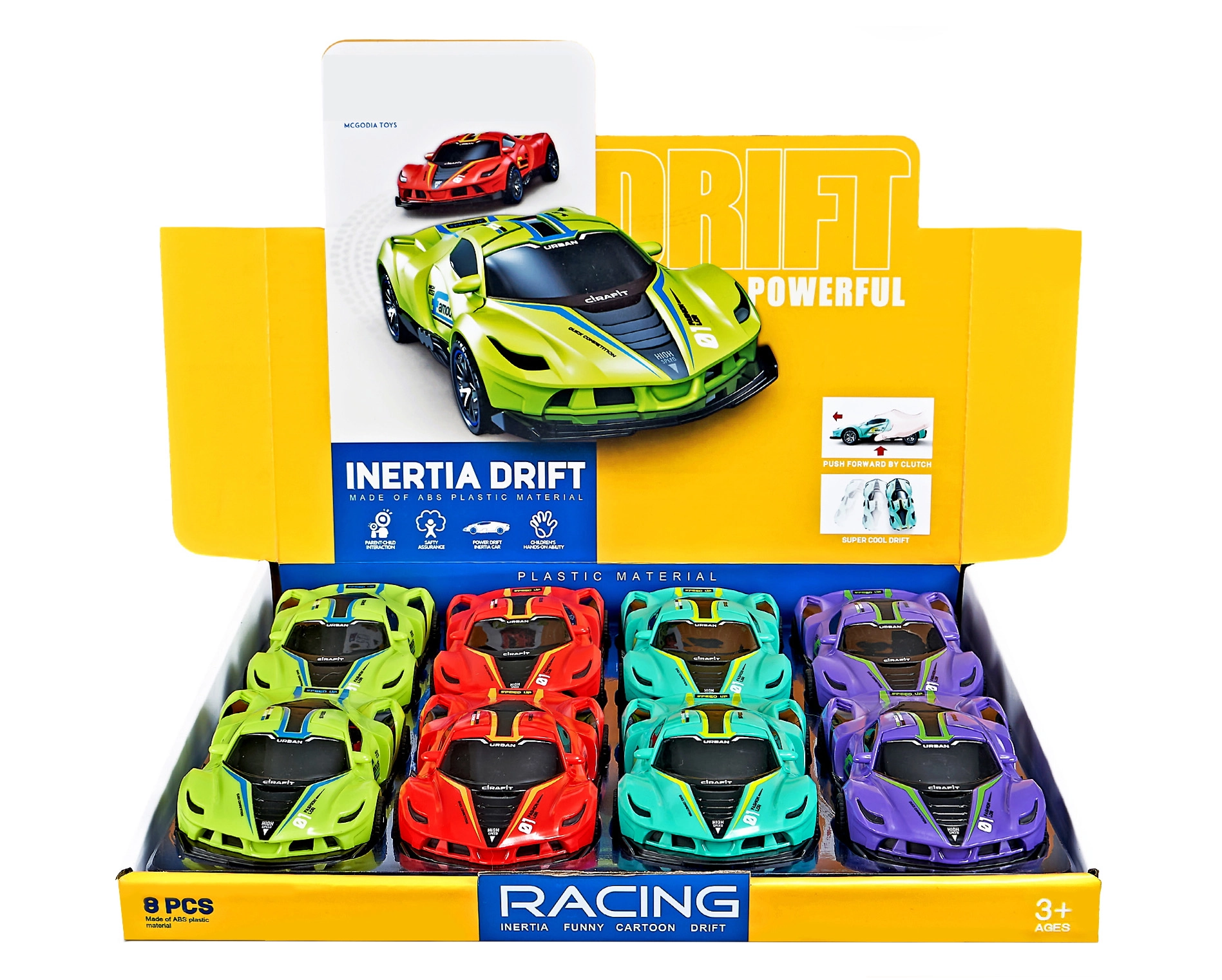 Driftiv hõõrdejõuauto mõõtudega 15,5 × 8 × 4 cm on ideaalne kingitus kõigile põneva kihutamise fännidele. See mudel on saadaval neljas erinevas värvitoonis – rohelises, punases, sinises ja lillakas-violetses.
