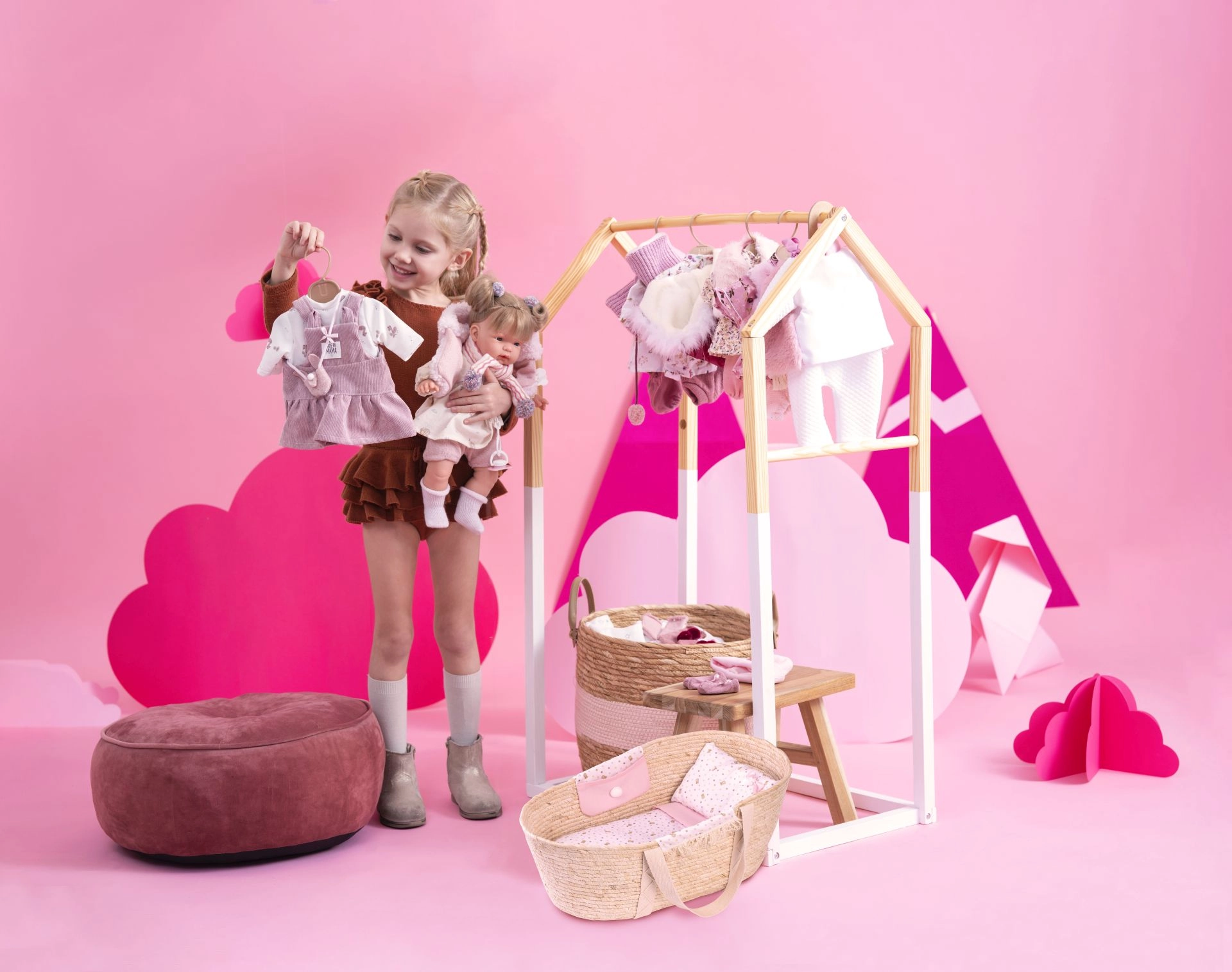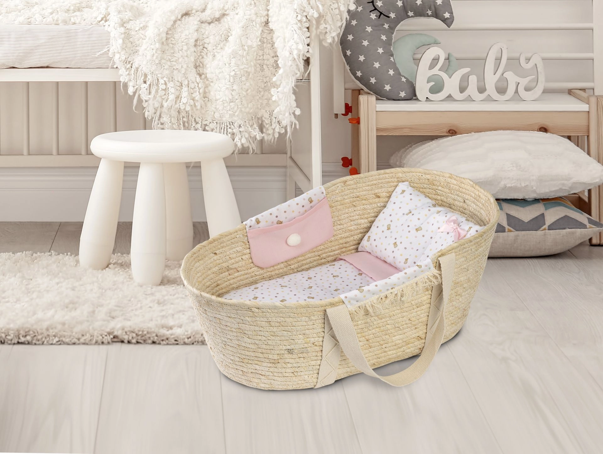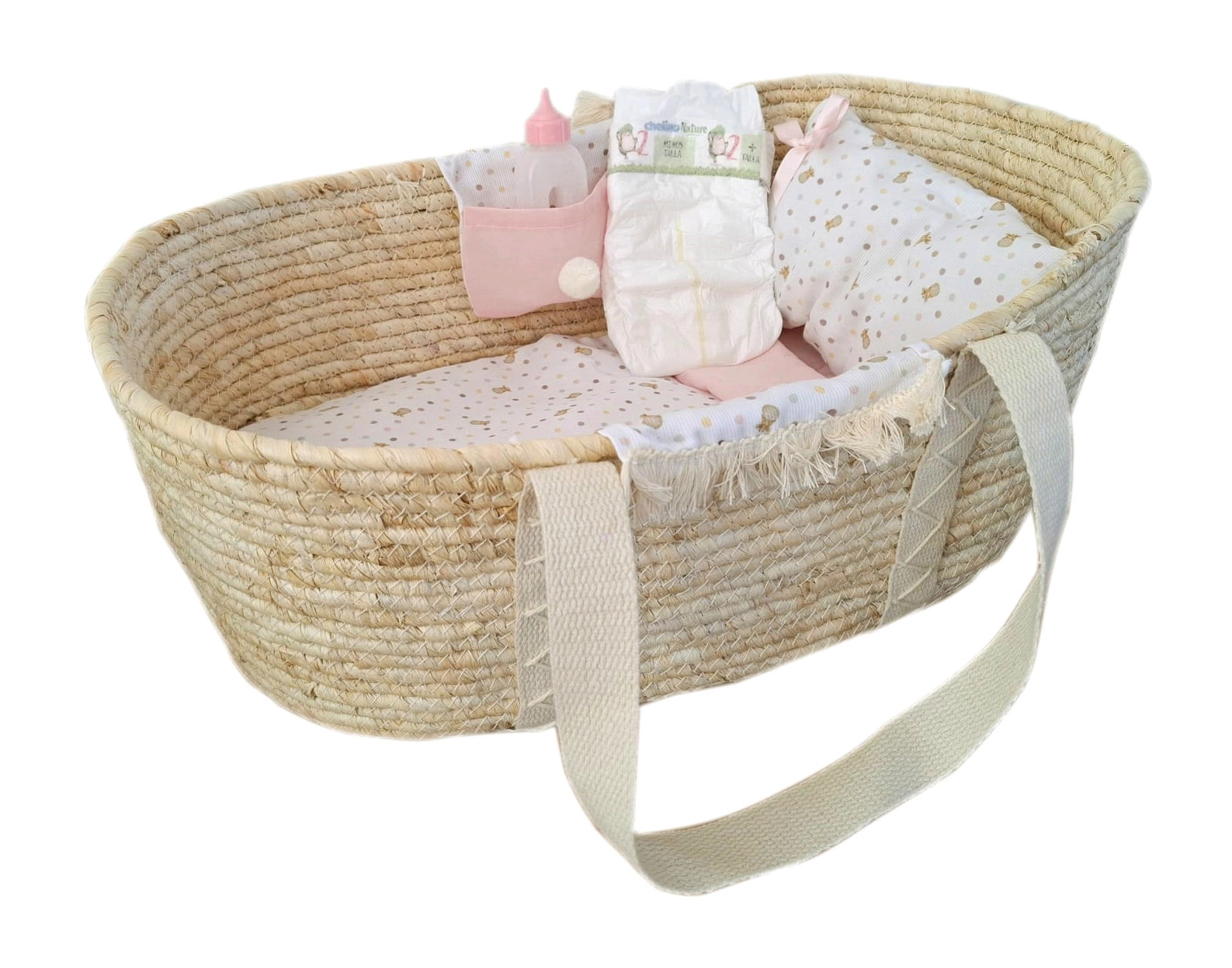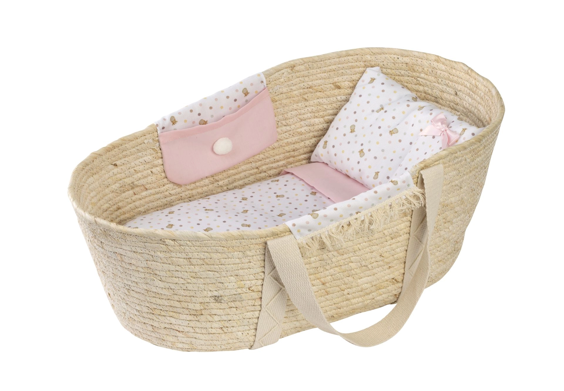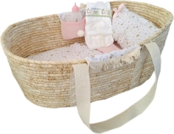 See kaunis Moosese korv on varustatud kangast taskutega mõlemal küljel ning komplektis on kaunistatud tekk, padi ja madrats. Sobib nukutele suurusega 40–45 cm, kuid toimib suurepäraselt ka hoiukohana teistele mänguasjadele, näiteks kaisuloomadele.