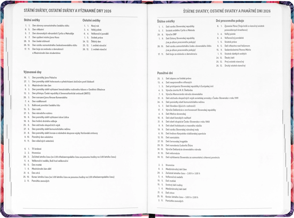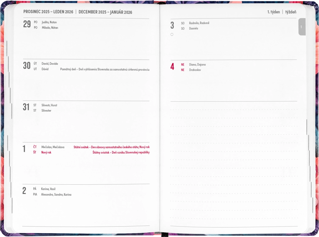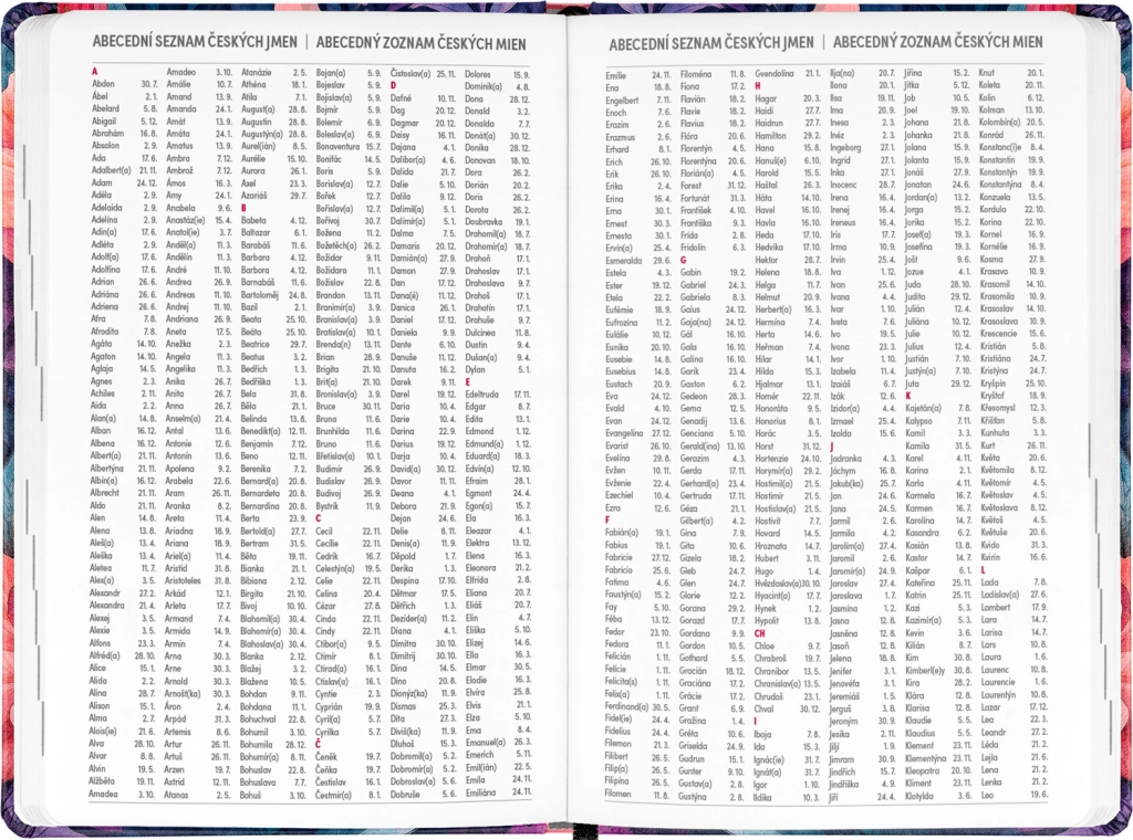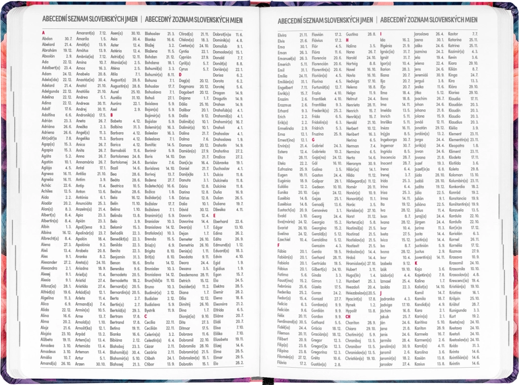 - Tšehhi‑Slovaki nädalavaate joondatud kalendariumi, mis sisaldab nimesid ja pühi.