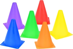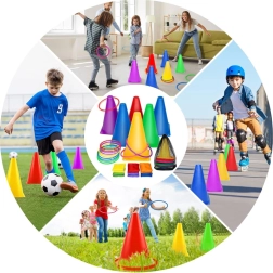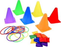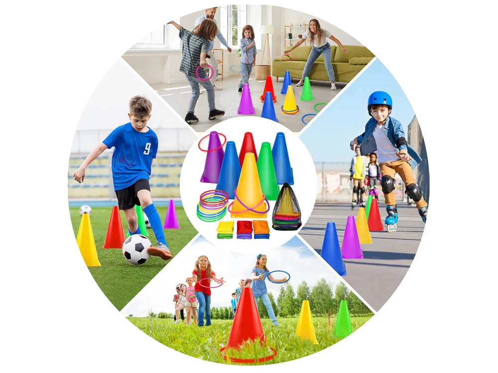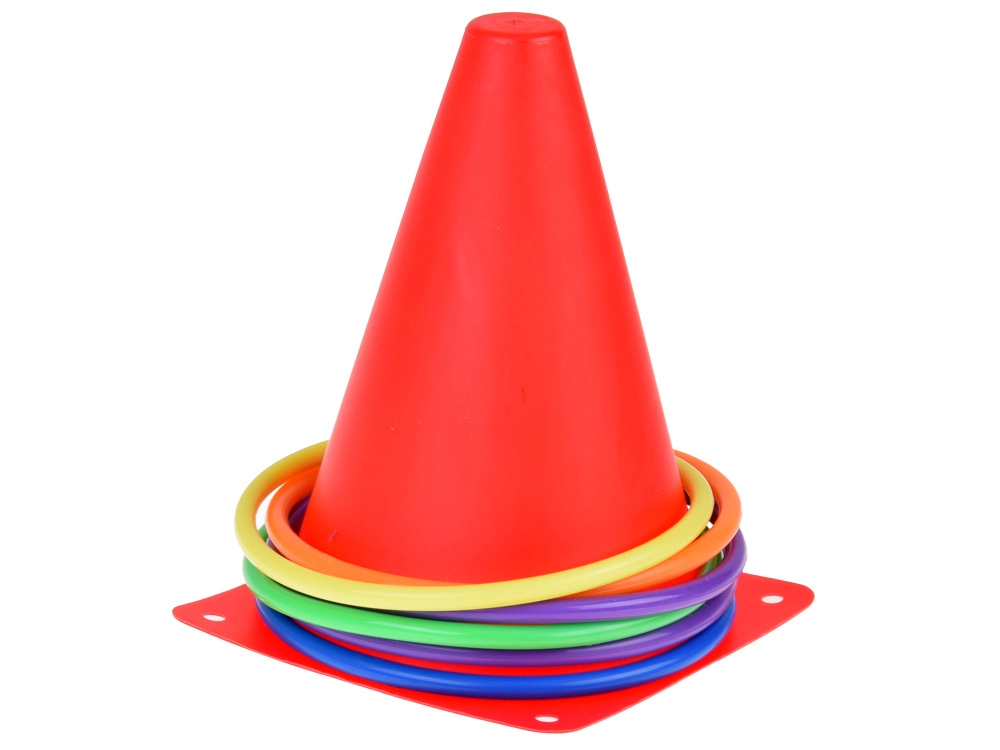 Komplekt sisaldab erksavärvilisi koonuseid ja rõngaid, mis köidavad tähelepanu ja tagavad mängurõõmu. Need sobivad suurepäraselt platside või punktide märgistamiseks.