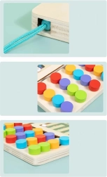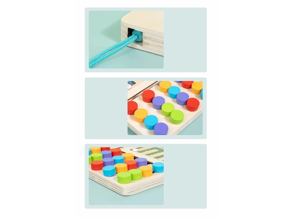 Puidust mängulaudal on erinevad mustrid, mis teevad värvide ja koordinatsiooni õppimise lihtsaks. Toetab laste loovust ja keskendumist.