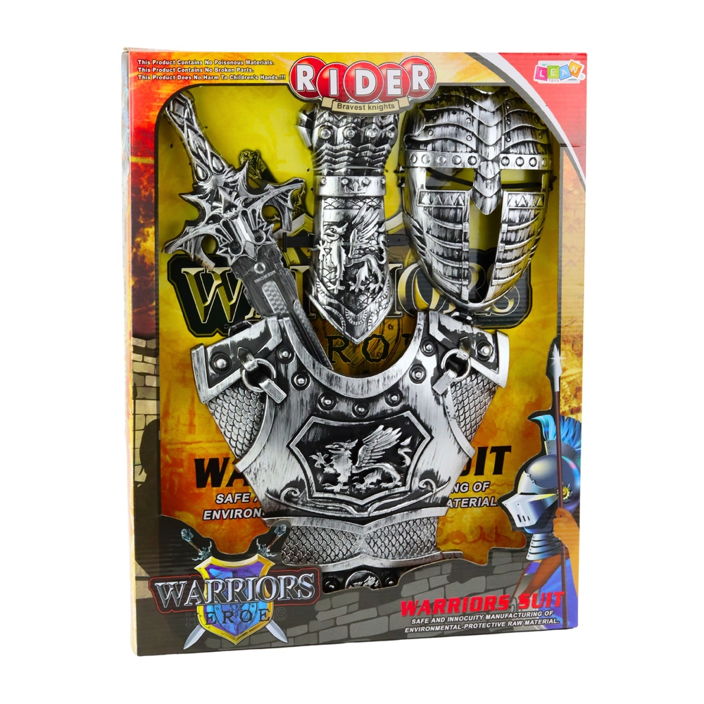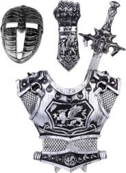 Rüütlikomplekt sisaldab kõiki vajalikke elemente täieliku rüütlikuju loomiseks – turvist, kilpi, kiivrit ja realistlikult viimistletud mõõka. Kõik komponendid on valmistatud vastupidavast plastist, mis tagab ohutu kasutamise ka kõige väiksematele lastele.