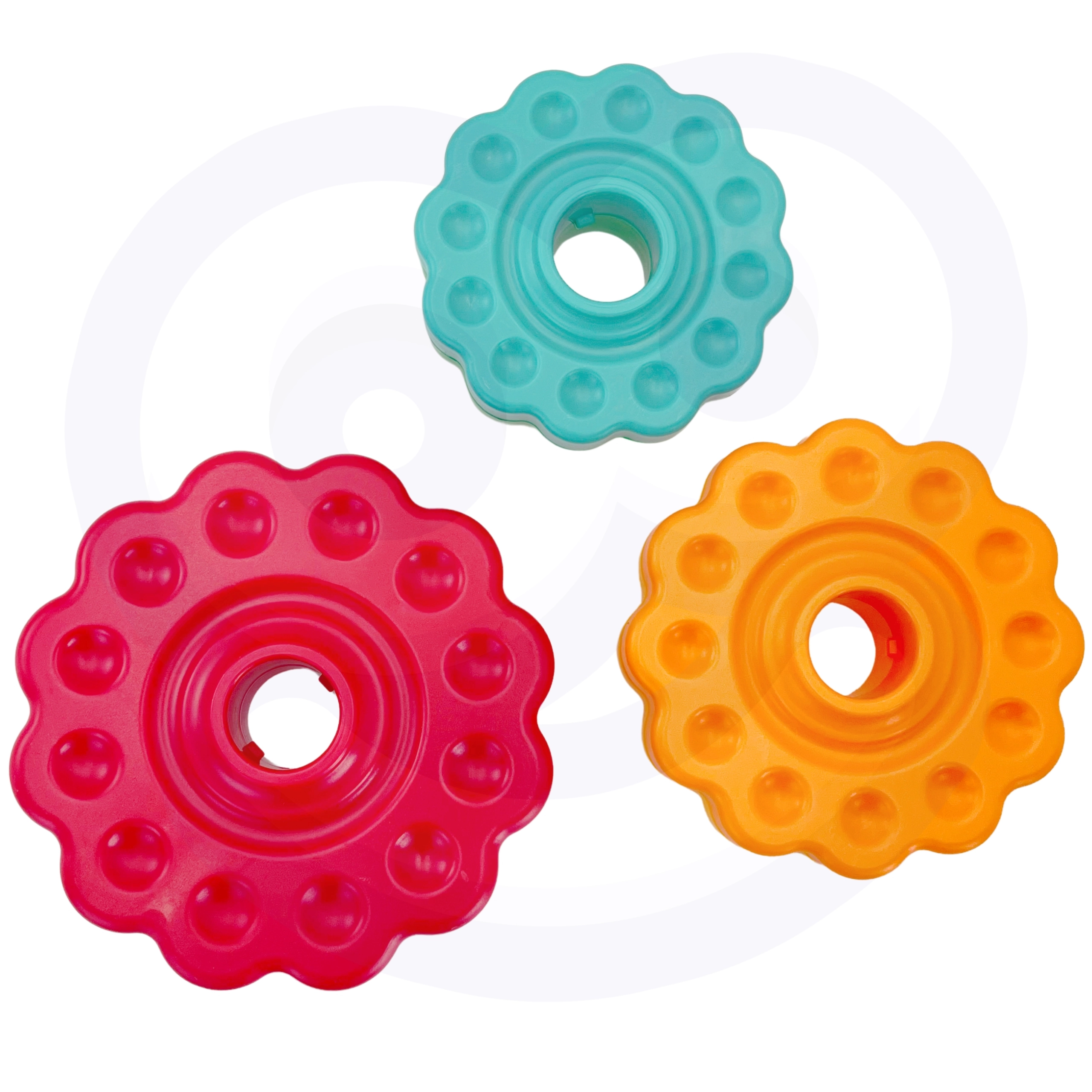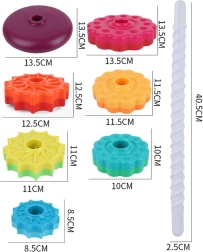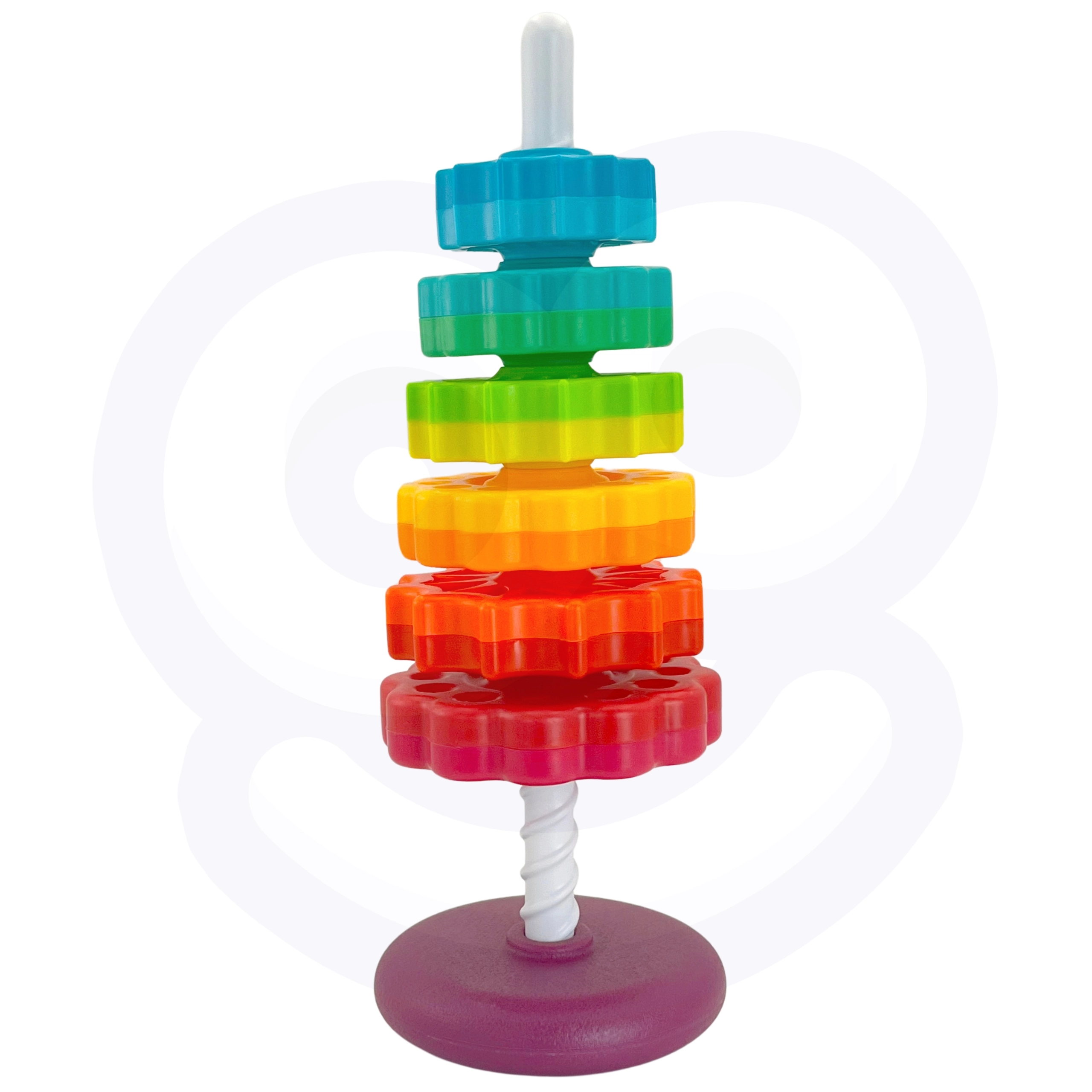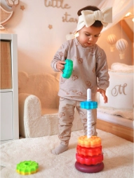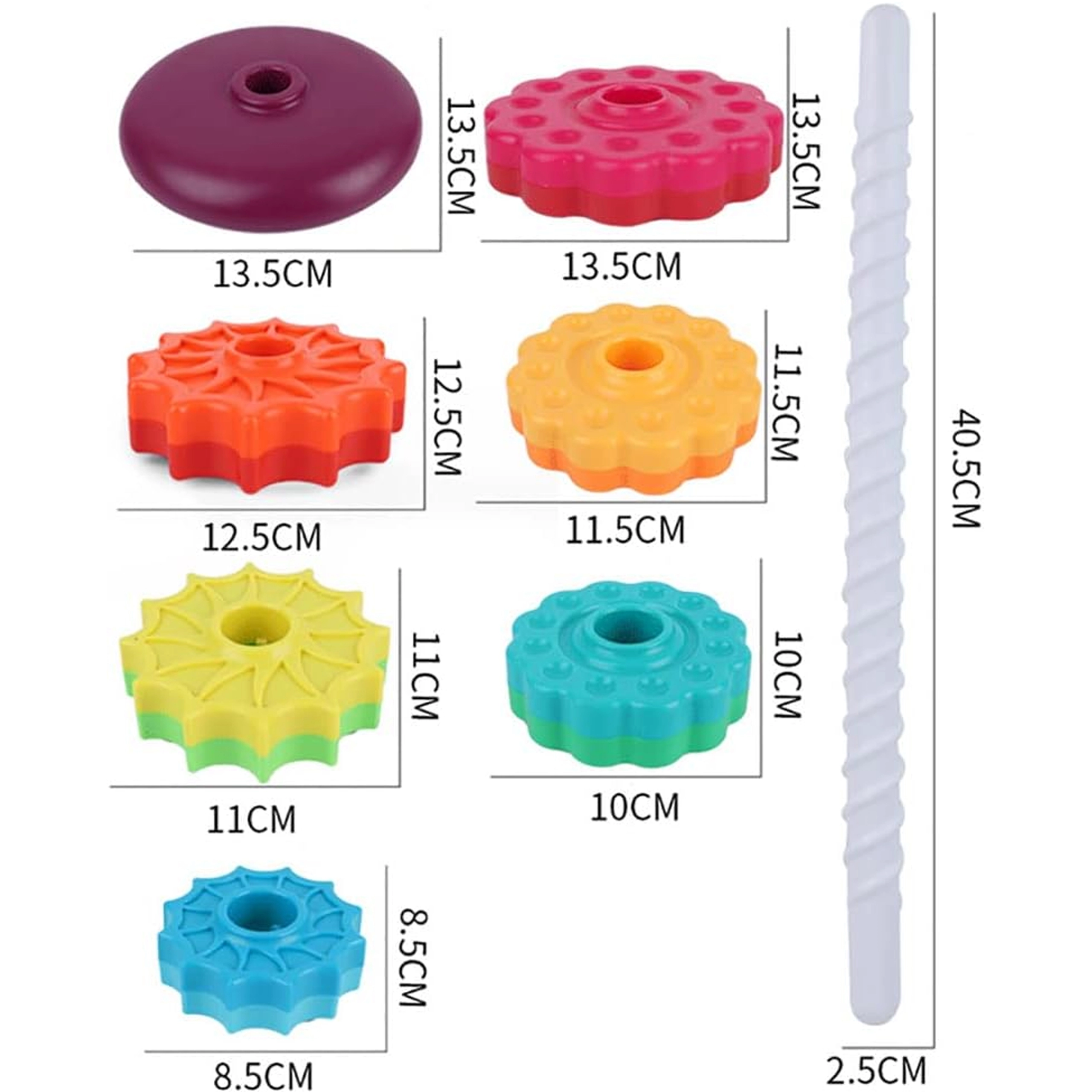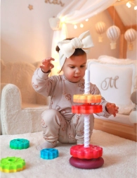 - Komplekt sisaldab kuut tähekujuga ketast, mida saab üksteise peale laduda, luues värvilise ja pöörleva püramiidi