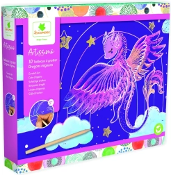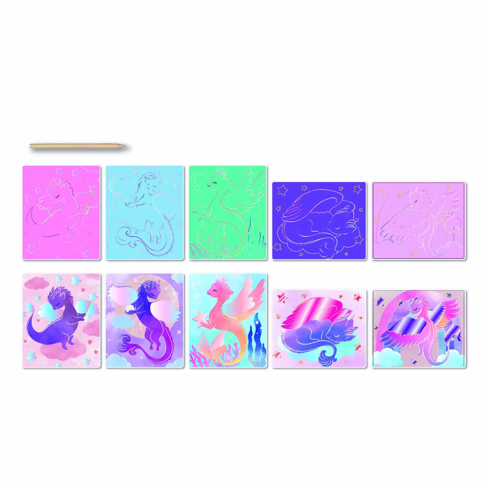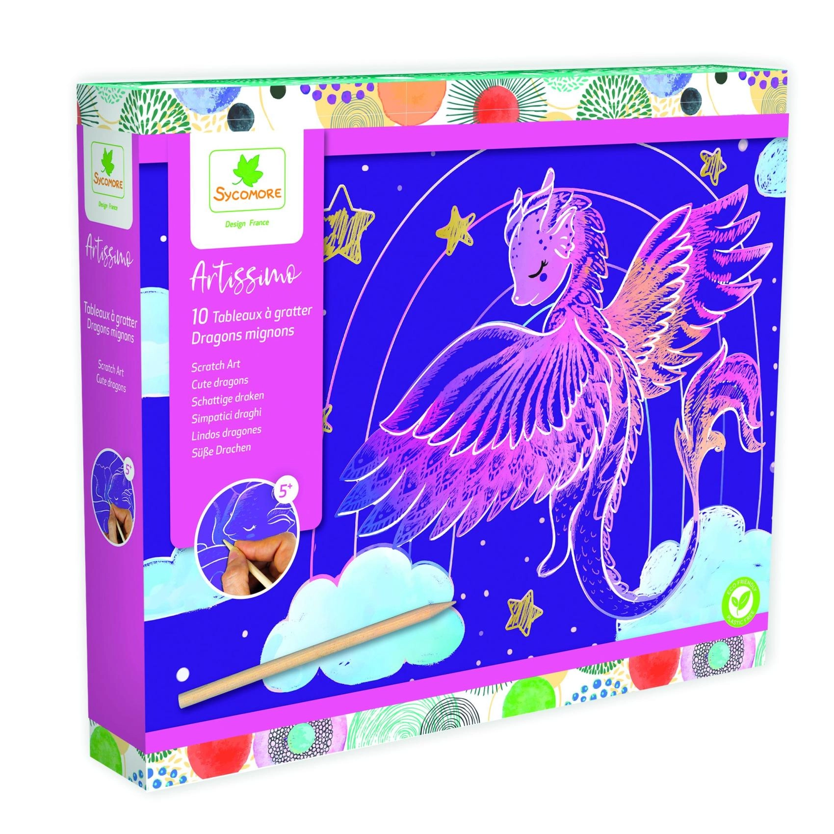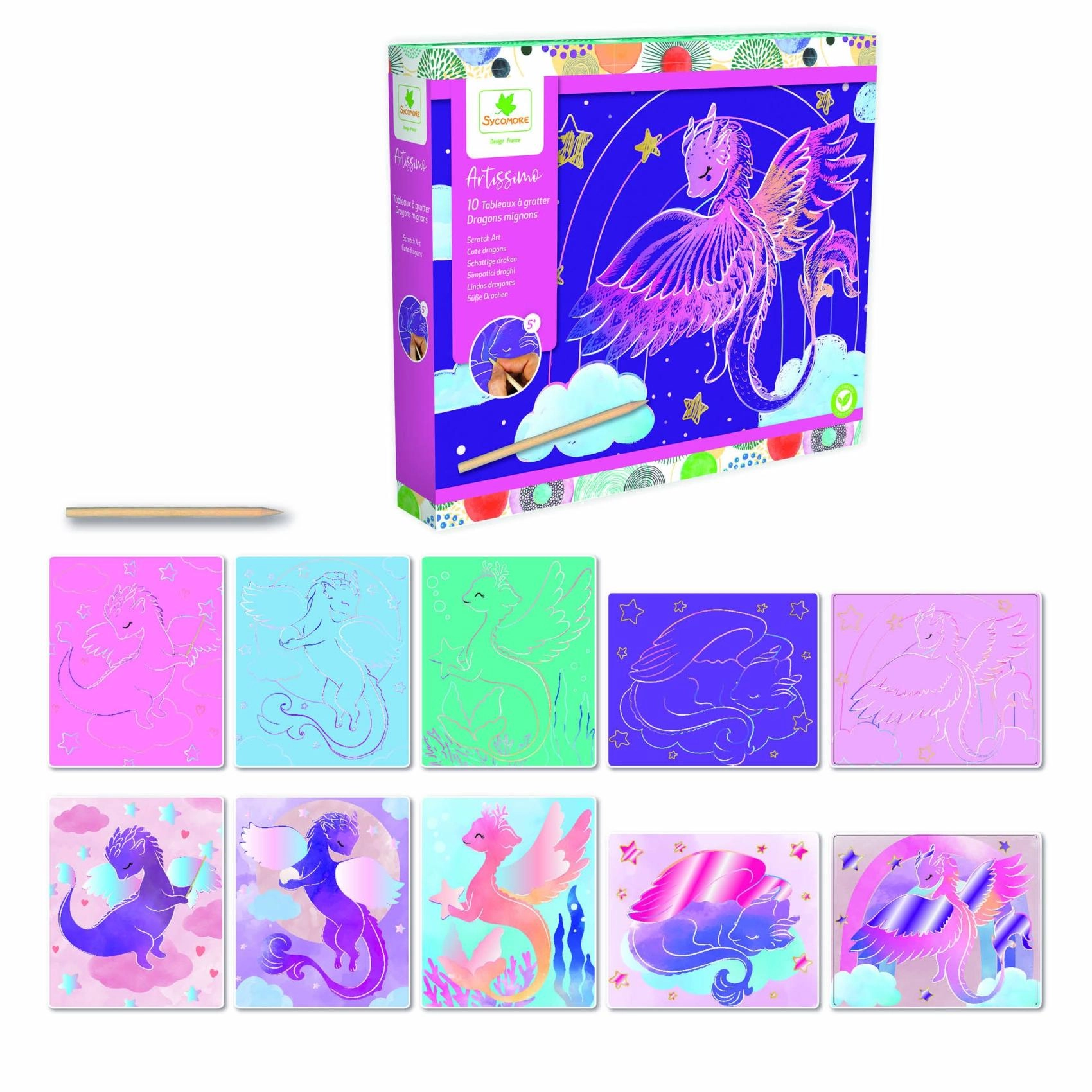 Lastele alates 5. eluaastast mõeldud loovkomplekt armsate draakonimotiividega pakub tunde meisterdamisrõõmu. Komplektis on 10 pilti, puidust kraapimispliiats ja juhend. Lihtsad võtted, kaunid värvilised motiivid ja peenmotoorika arendamine teevad sellest ideaalse kingituse väikestele loojatele.