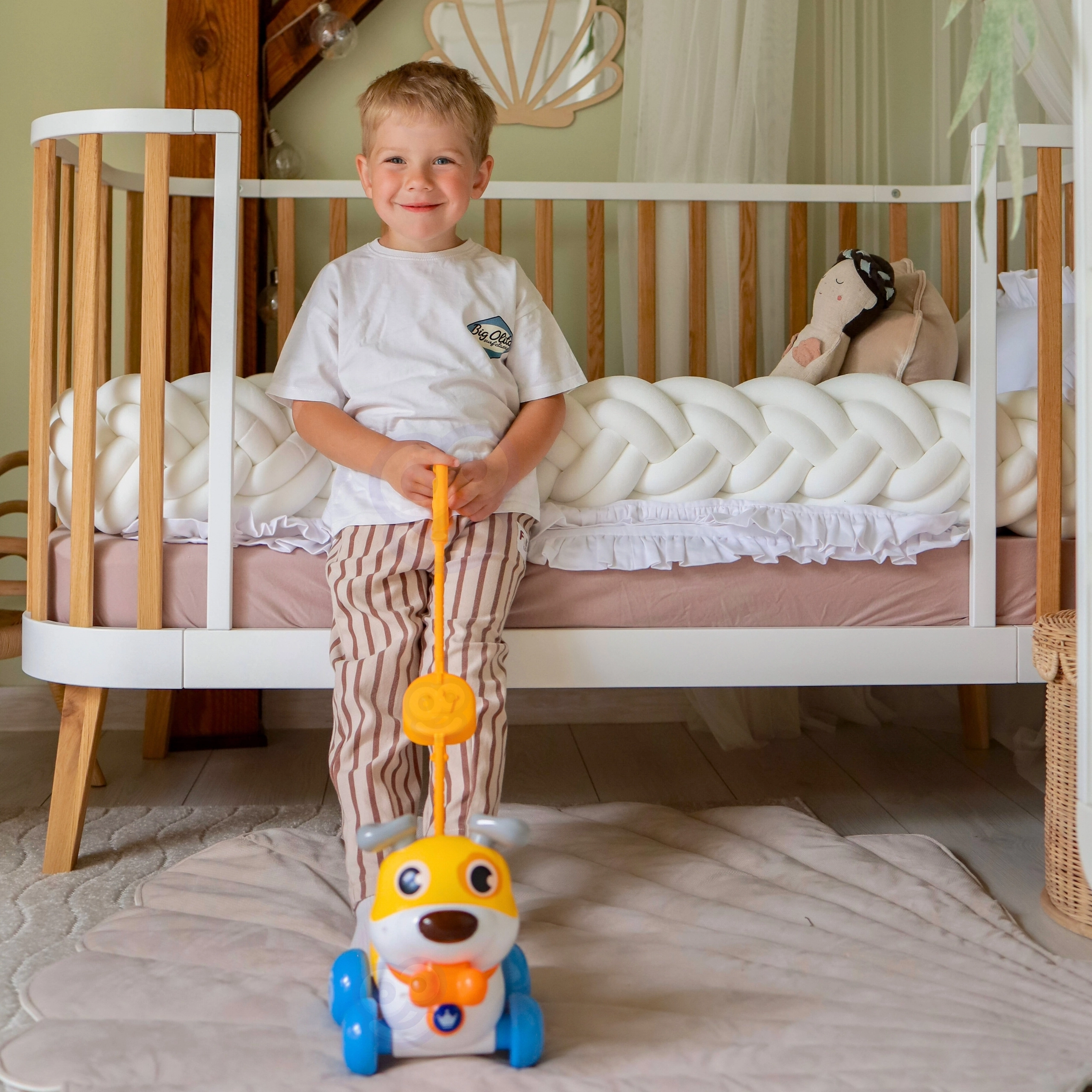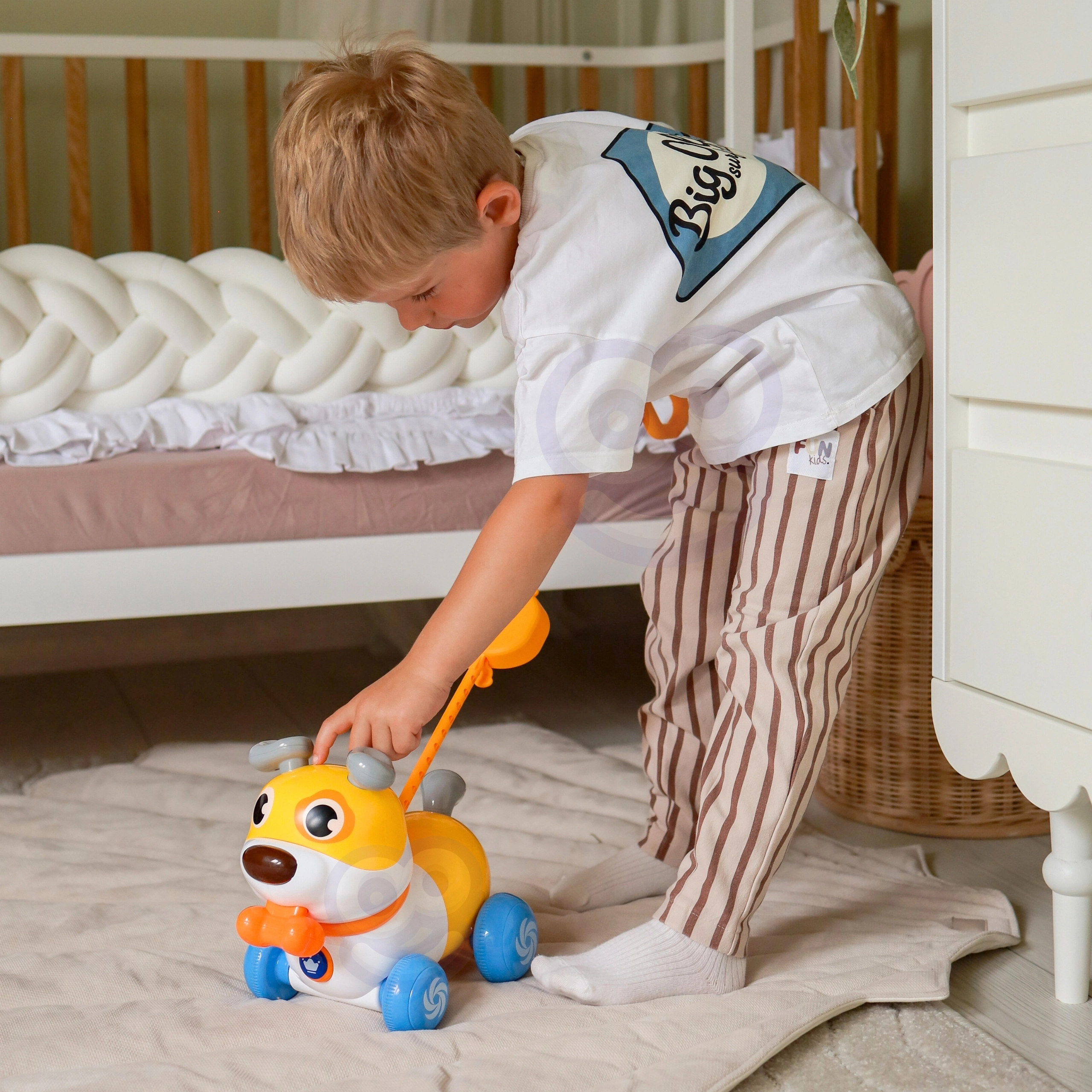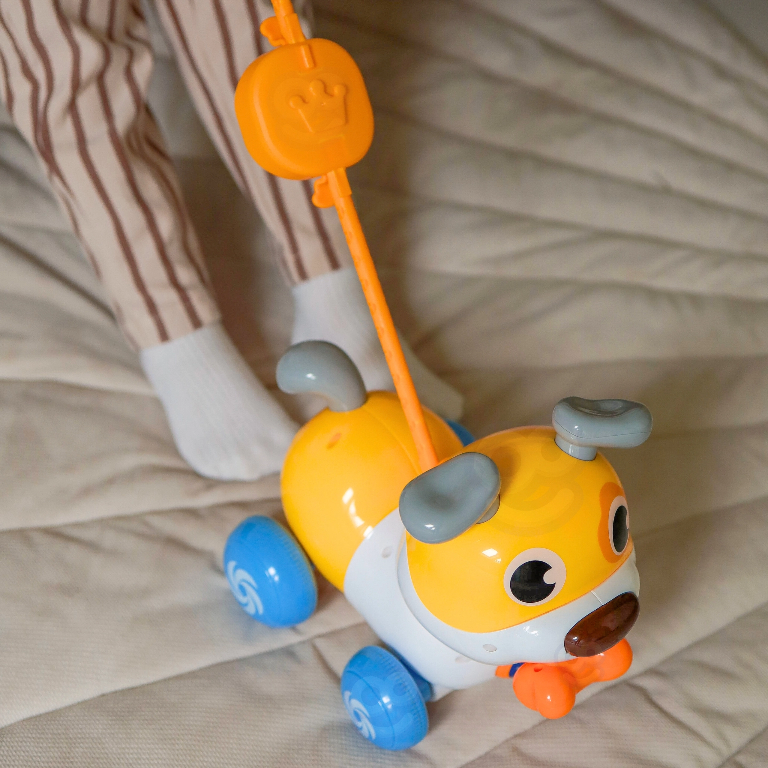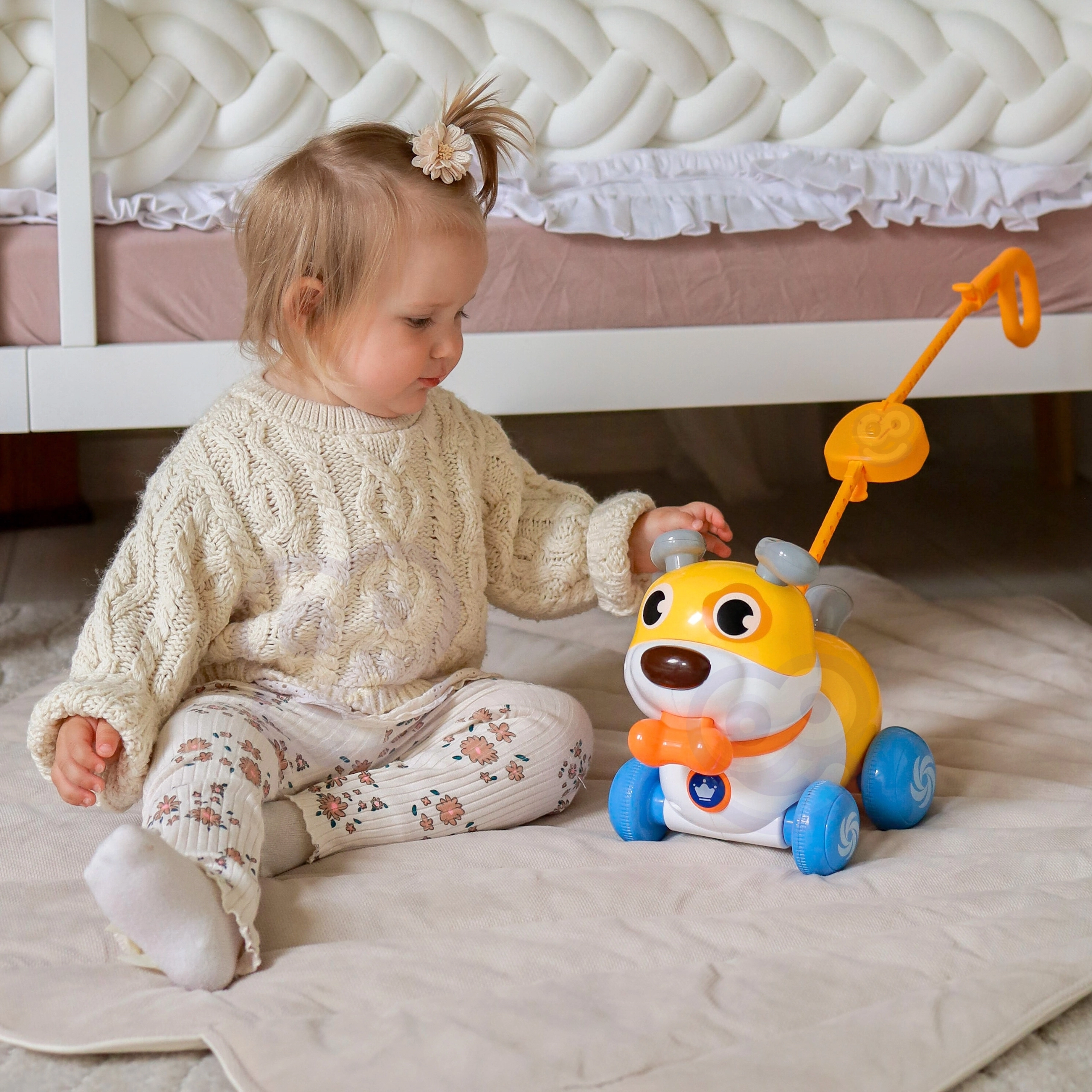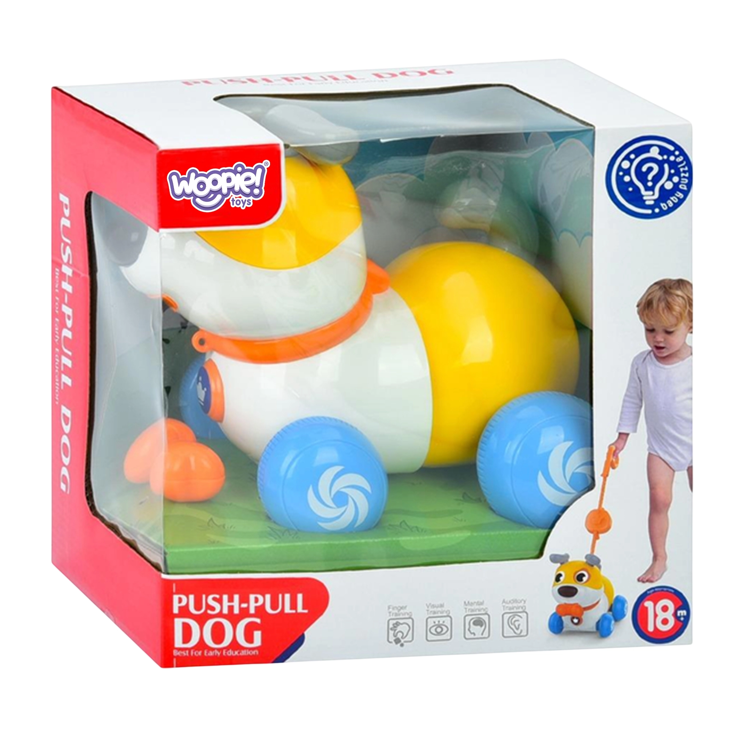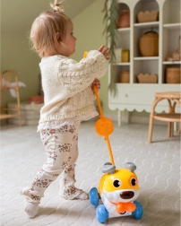 Kasutage kas lükkemänguasjana pika varrega või tõmmatava kutsikana rihmaga. Suurepärane kõnnaku ja koordinatsiooni arendamiseks.