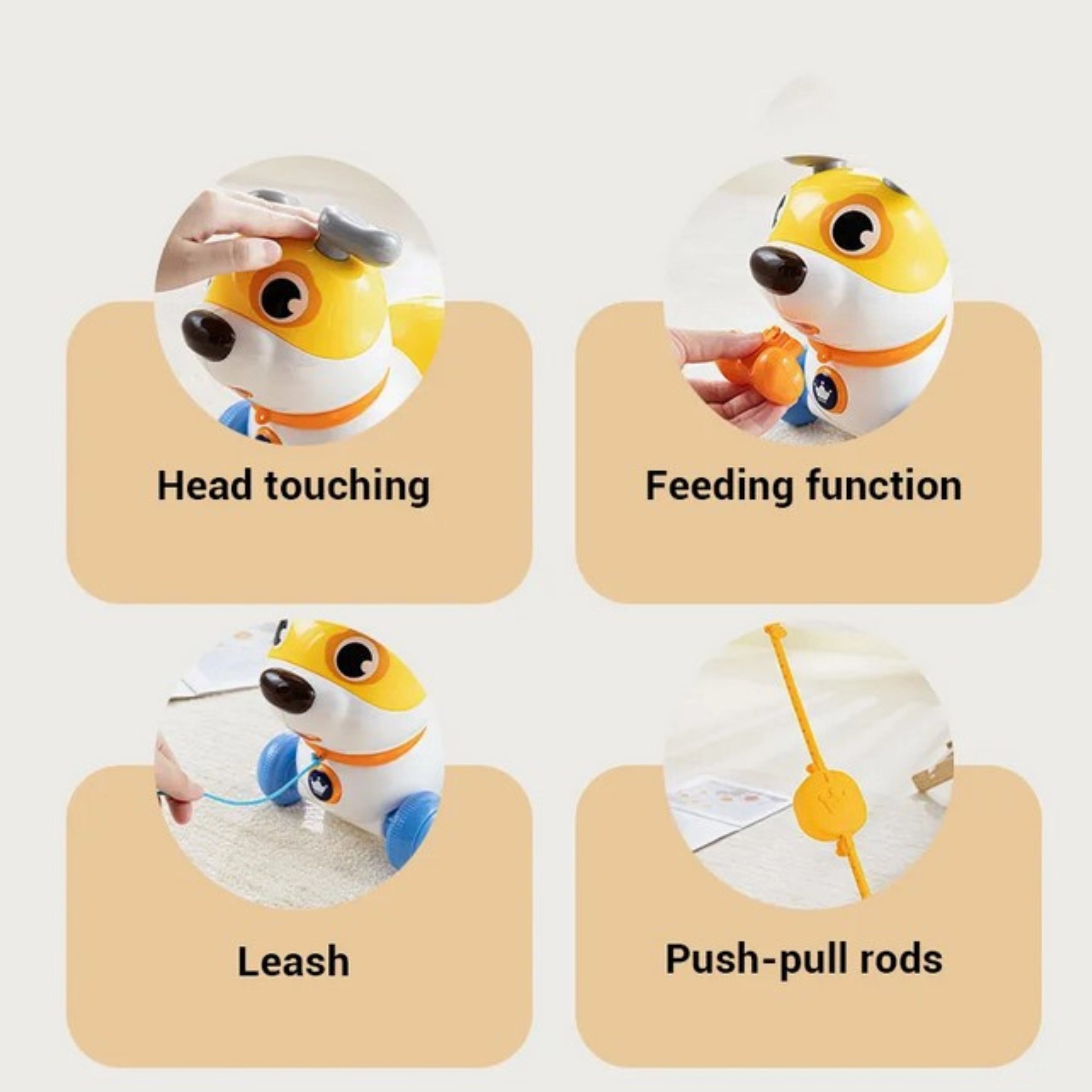 Kutsikas haugub ja teeb realistlikke helisid, reageerib puudutusele ning pärast „söömist“ kaasasoleva kondiga näitab oma rõõmu. 360° pöörlevad kõrvad ja saba suurendavad sensoorset stimulatsiooni, samal ajal kui elastne käepide võimaldab sujuvat libisemist põrandal ilma takerdumiseta – nii kodus kui vaibal.