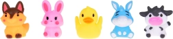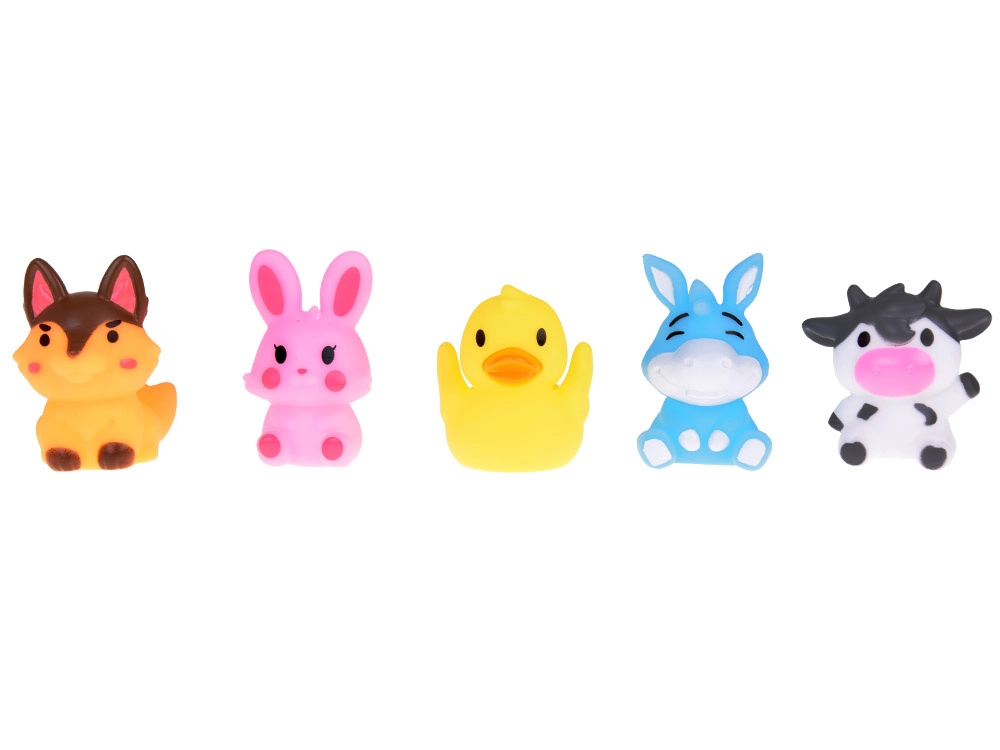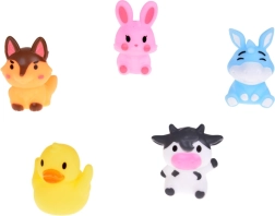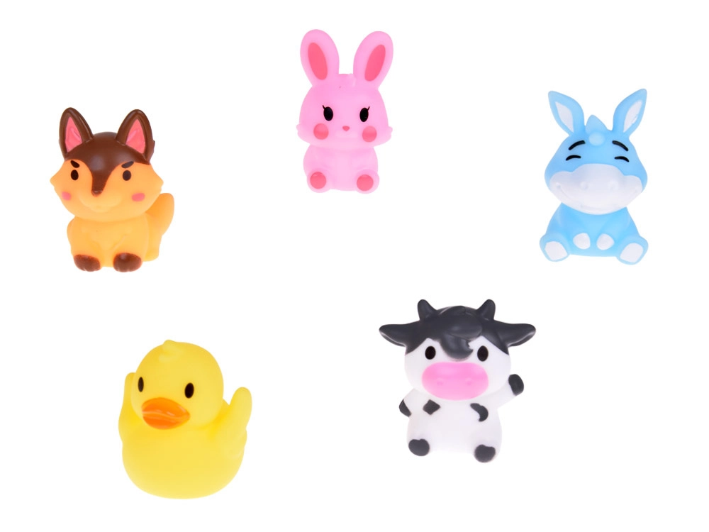 Komplektis: 5 kummist talulooma figuuri, igaüks erinevat värvi (jänes, lehm, koer, part, eesel) ligikaudsete mõõtudega 5 cm × 4 cm × 4 cm. Mänguasi on valmistatud ohututest kummimaterjalidest, mis on sõbralikud tundliku lapse naha vastu. Lihtne hooldada ja väga vastupidav, pidades vastu pikka aega.