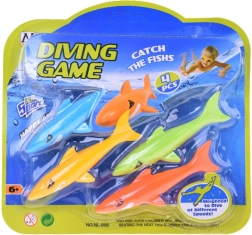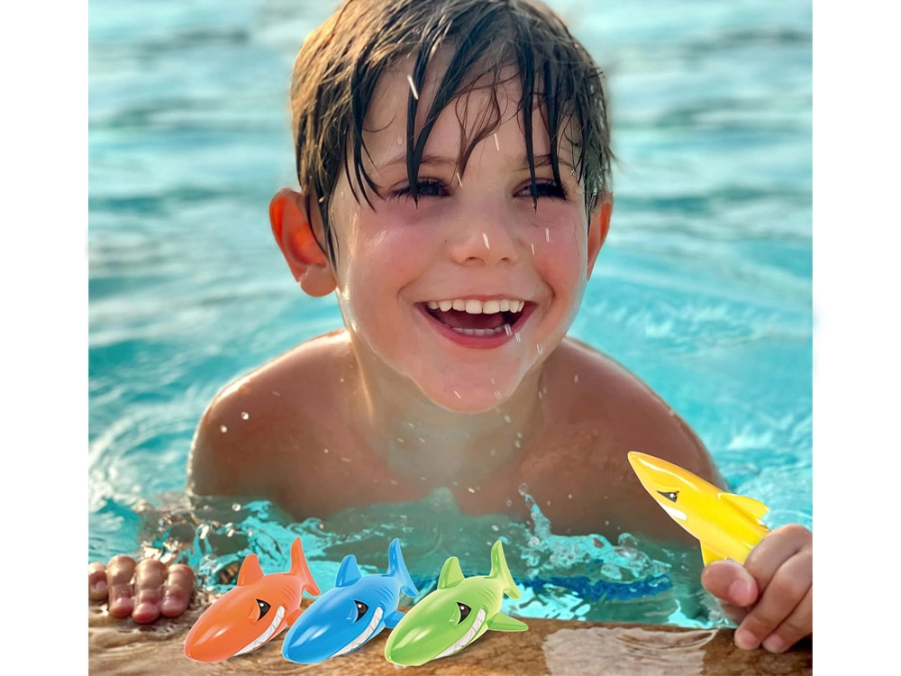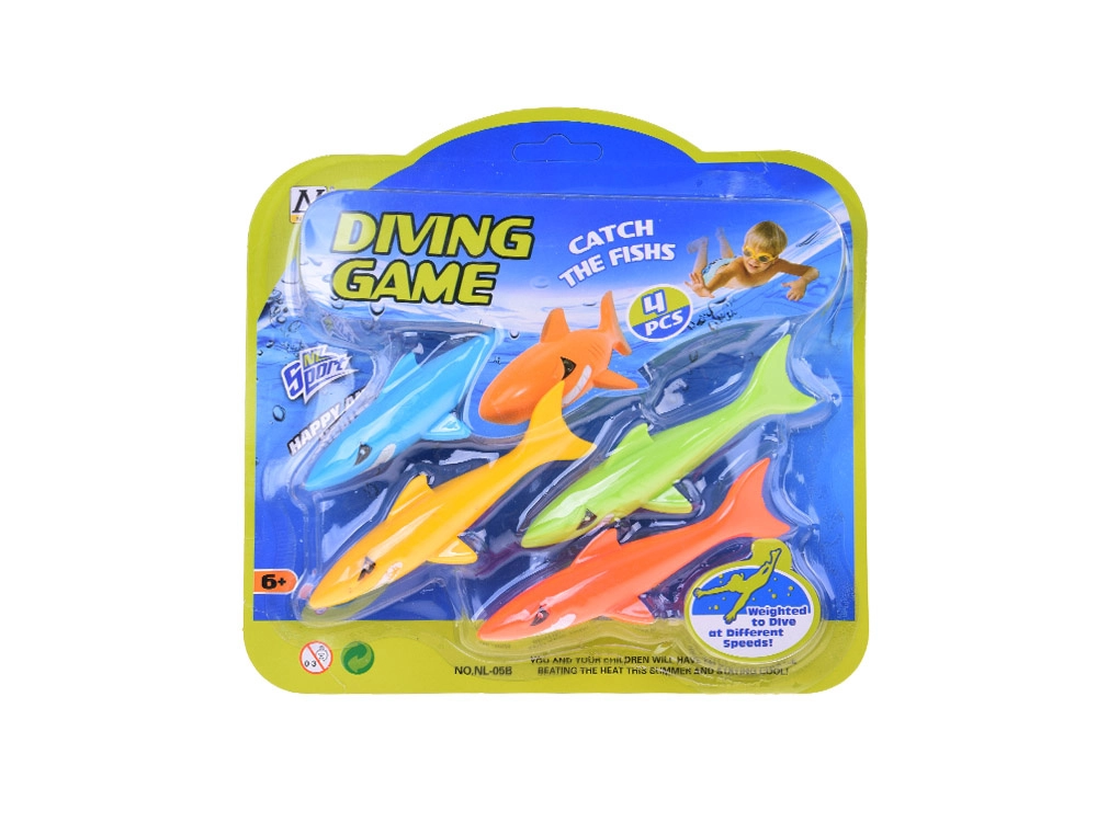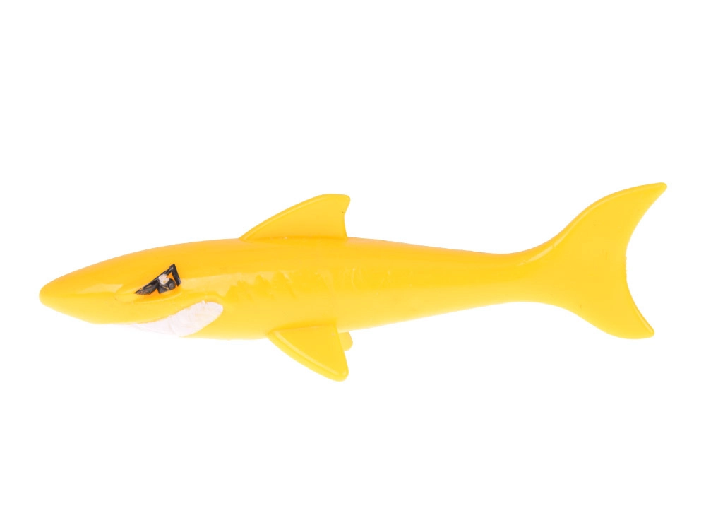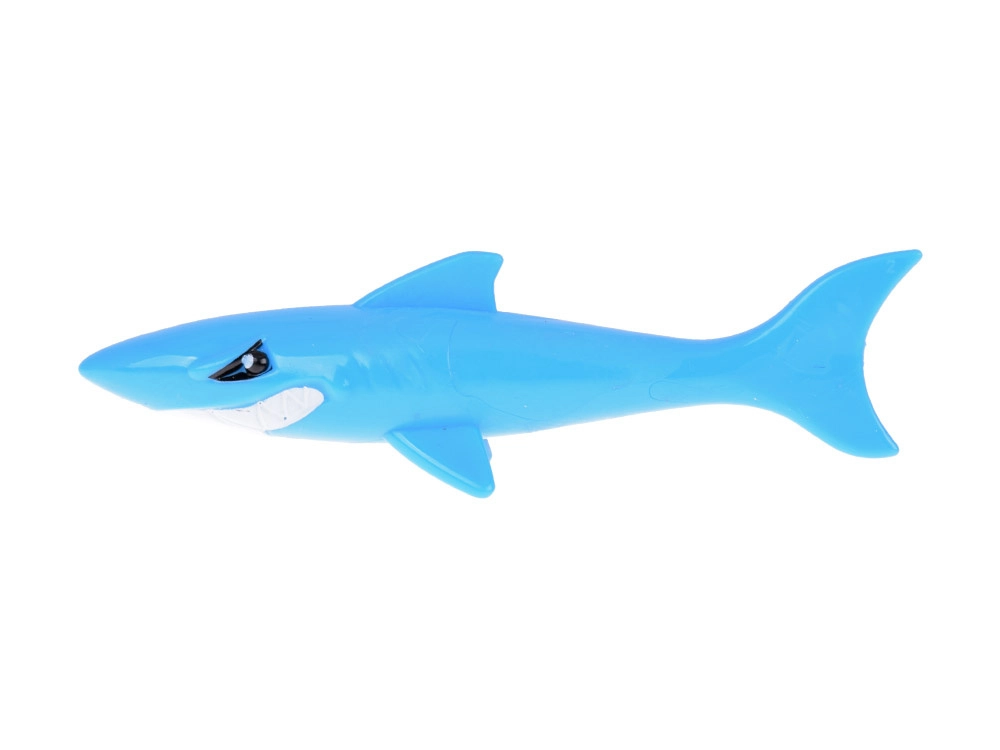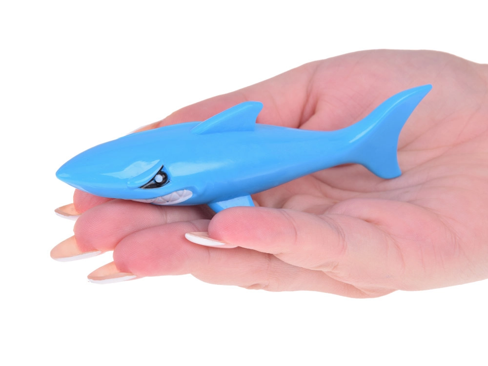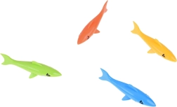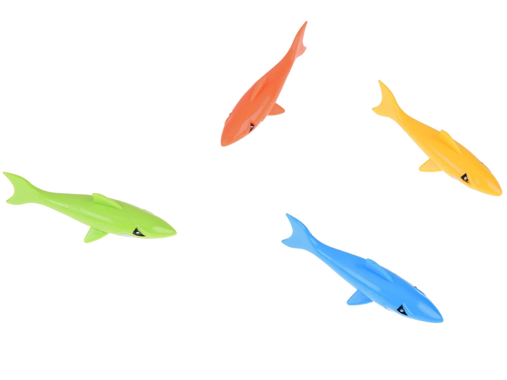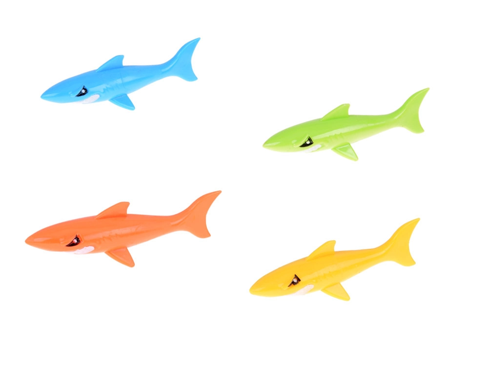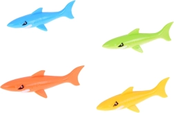 Komplekt sisaldab 4 värvilist haid ligikaudu 12 cm pikkused ja 3 cm laiused, valmistatud pehmest, vees uppuvast kummist. Mänguasjad on meeldivad katsuda, ilma teravate servadeta ja täiesti ohutud veemängudeks nii basseinis, madalaveealal kui ka vannis.